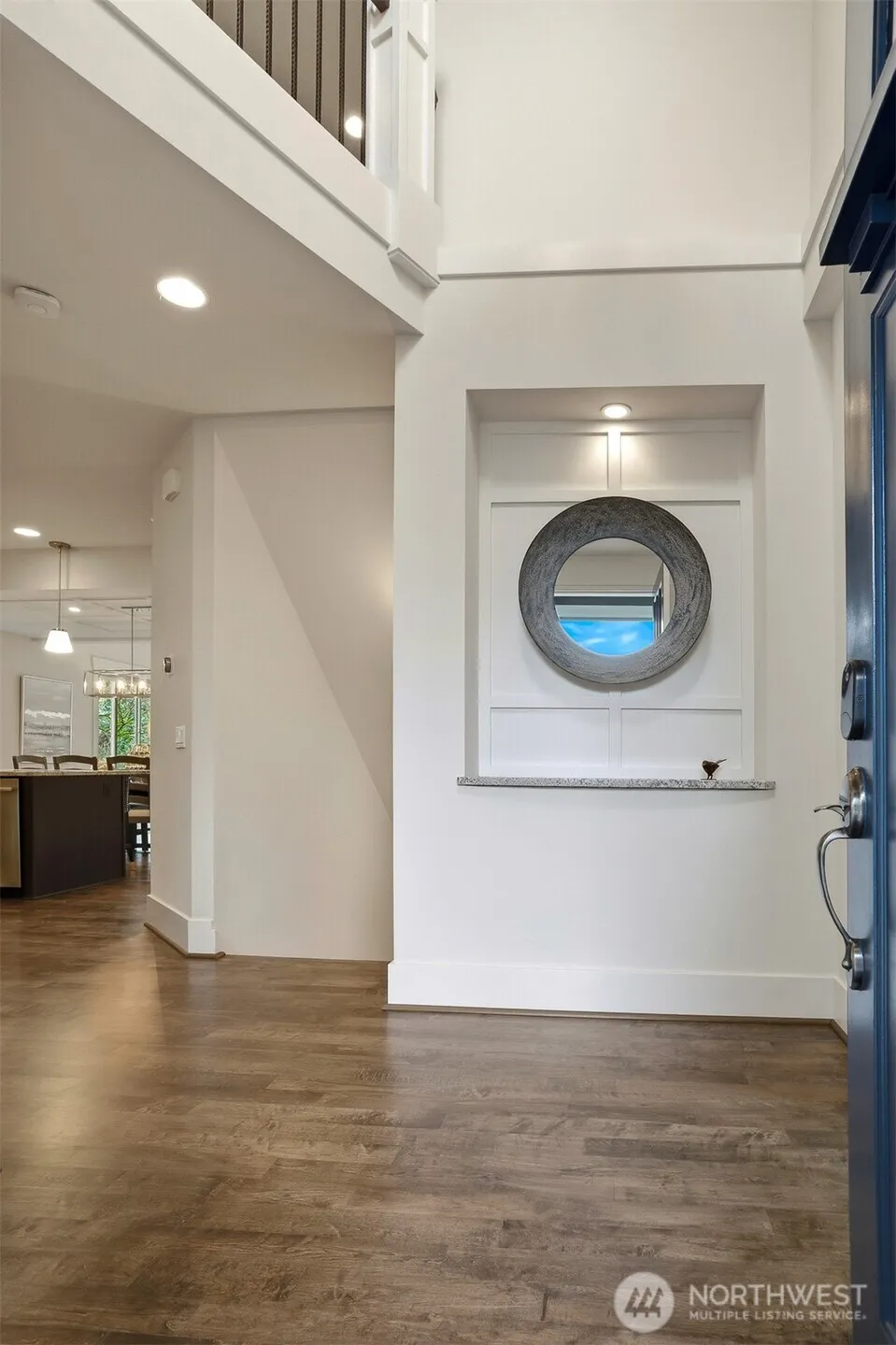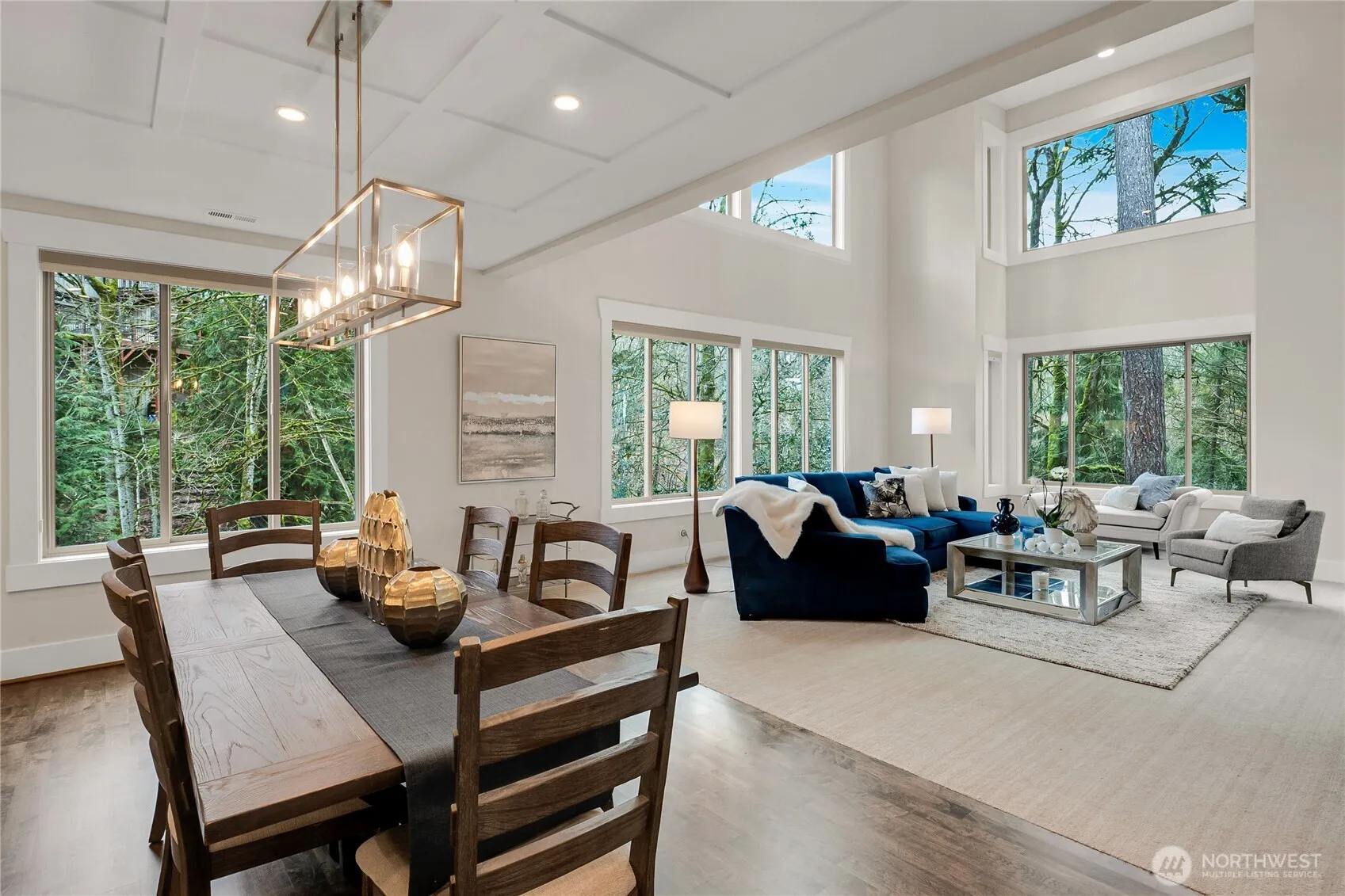 Imagine being fully immersed in nature while enjoying more than 4,700 square feet of refined modern comfort. Expansive windows and soaring ceilings pair beautifully with rich granite surfaces and freshly refinished hardwood floors, effortlessly drawing the outdoors in. The home feels as though it rests within a private park—surrounded by trees and enveloped in exceptional privacy. This Jay Marc Home was designed with entertaining in mind, with an open-concept layout that offers a generous living area and a chef’s kitchen complete with an oversized island, 36″ Viking range, and custom cabinetry. Five bedrooms and four-and-a-half baths provide remarkable flexibility, including two primary suites with ensuites—one conveniently located on the main level. Upstairs, a bright loft accompanies two additional bedrooms and a second primary retreat. The lower level impresses with soaring ceilings and expansive windows, offering excellent ADU potential with a kitchenette, one bedroom, a full bath, and a sprawling family room immersed in greenery. Recent updates include full interior paint, new carpet, and exterior paint in 2024. Abundant storage throughout enhances everyday ease. Ideally located near schools, shopping, neighborhood trails, and a dog park, plus quick access to Bellevue and Seattle. Comes complete with a two-car garage, jacuzzi, and A/C, this home seamlessly blends comfort, privacy, and convenience.