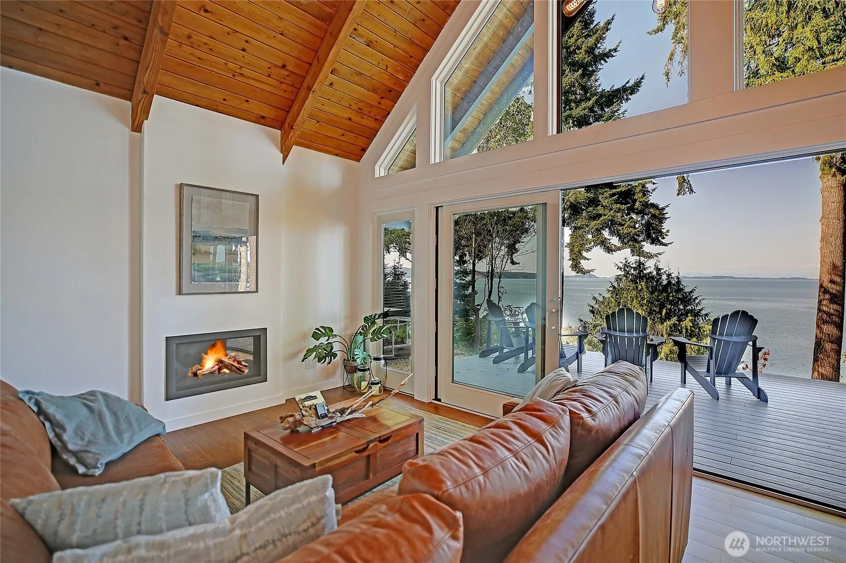 Immaculate waterfront home with extensive updates inside and out, including a fully gutted and rebuilt kitchen, upgraded windows with sliding door system, gas fireplace, bamboo flooring, fresh carpet, and updated interior and exterior paint. Additional improvements feature radiant wall heaters, modern light fixtures, updated doors, and more. Vaulted ceilings and an open floor plan frame breathtaking views of Puget Sound and Mt. Baker. Featuring 2 bedrooms plus a spacious loft, this property is ideal for full-time living, a vacation retreat, or short-term rental potential. Enjoy private stairs to the beach with bulkhead and storage shed. No HOA. Conveniently located just minutes from a boat launch, parks, and restaurants.