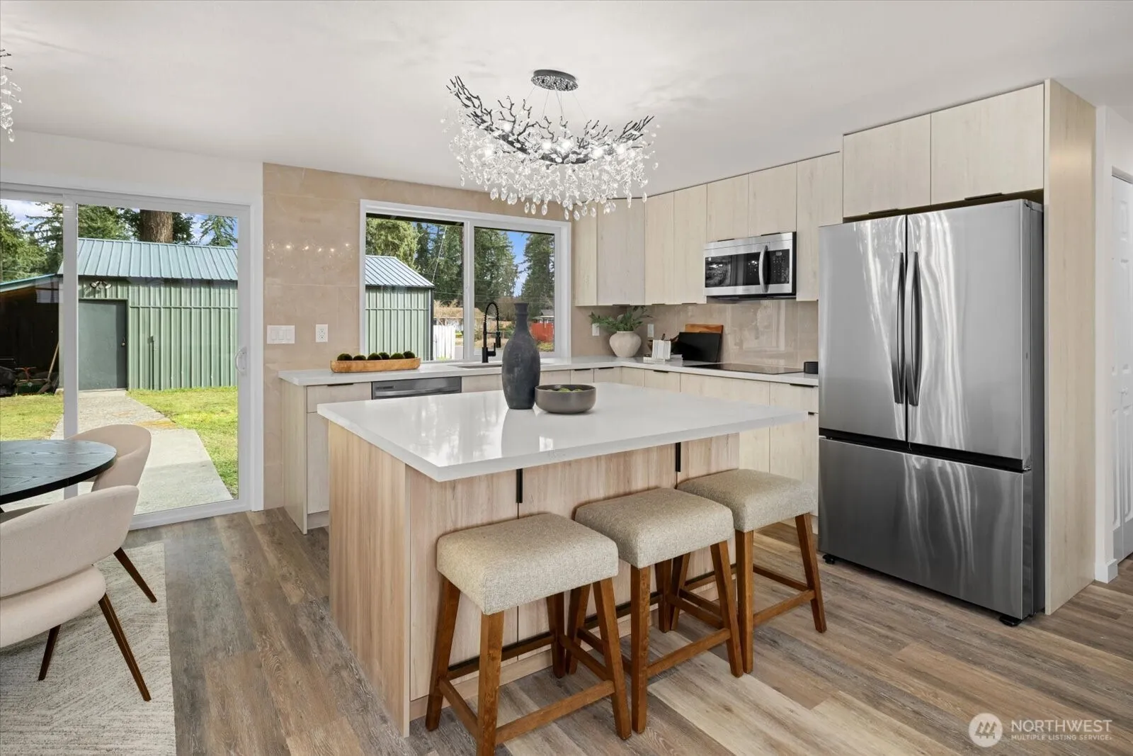 Completely renovated with modern tasteful finishes, this thoughtfully designed home offers the perfect balance of style & functionality Located on a desirable corner lot, it provides privacy, space & flexibility. The home features 3 bedrms, an office & a bonus room w/a layout that feels both efficient & intentional. The primary suite is a true retreat, complete w/direct access to the deck—ideal for quiet mornings or unwinding in the evening. Nearby, an oversized room offers exceptional versatility & can easily serve as a playroom, studio, home office, or additional bedroom. Living spaces feel warm and inviting, highlighted by an electric fireplace & a striking modern feature wall with wood panels and sleek bar lighting, creating a clean, cozy, & contemporary atmosphere. The kitchen is bright & welcoming, featuring new appliances, beautifully selected cabinetry & a timeless modern design suited for everyday living and entertaining.Additional bedrooms are well positioned to allow for comfortable separation of space & privacy.One bedroom features a semi-en suite bathroom, offering added convenience.Outside the spacious backyard provides endless possibilities for recreation, gardening or future projects. A detached 670sqft garage offers excellent space for a workshop, hobby area, or additional storage. Ample parking is available in the driveway, off street & in the backyard.This move-in-ready home combines thoughtful design, modern upgrades & a highly desirable corner-lot setting