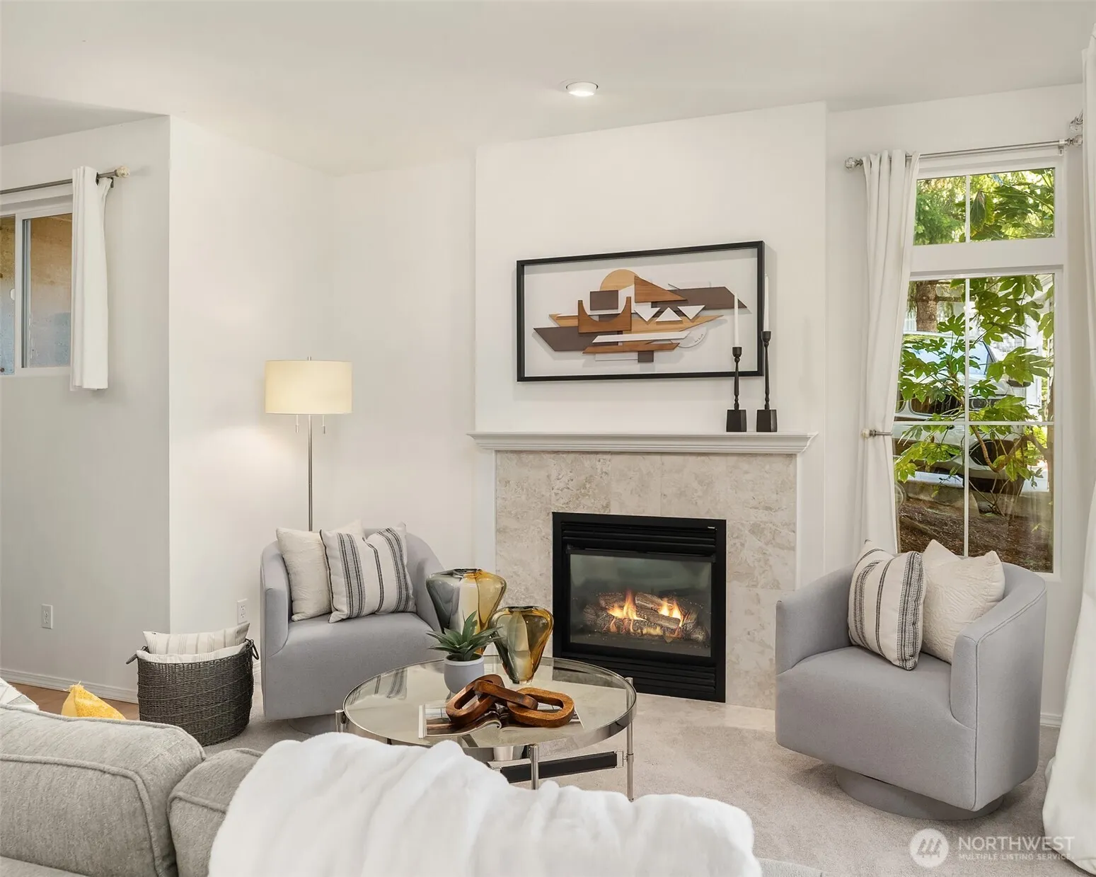 Summerhill Village the perfect blend of charm and convenience. Easy single level living with no stairs. Sought-after condominium & townhome community nestled just above Issaquah’s vibrant downtown. This beautifully designed ground level condo boasts 9-foot ceilings and an open-concept layout centered around a cozy gas fireplace. Bright, open kitchen with breakfast counter. Separate dining room. King-sized primary gets morning sun & view of courtyard with extra wide soaking tub, dual sinks & walk-in closet. 2nd BR or den also has morning sun & view of your private patio garden. The oversized one-car garage, steps from the front door, offers ample storage. Enjoy the benefits of a well-managed HOA with low monthly dues, no rental cap, and pet-friendly policies. Top-rated Issaquah School District.