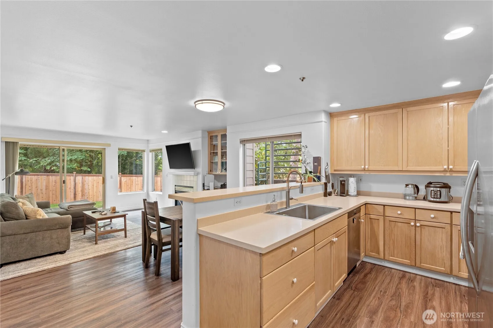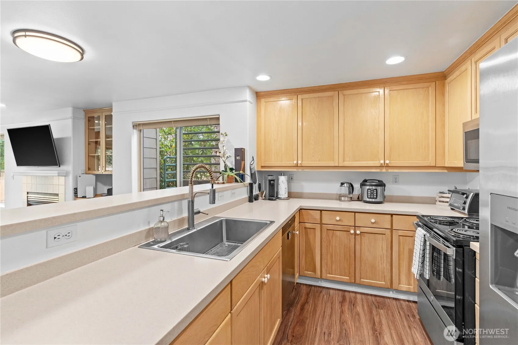 Welcome to Crystal Ridge! This ground-floor end unit condo offers an open-concept floorplan. Living area features a cozy gas fireplace (gas included in HOA), flowing to a patio & spacious grassy space—perfect for pets or outdoor lounging w/new fence. Enjoy a private 1-car garage w/potential loft storage plus an extra uncovered parking spot. The spacious primary suite features generous closets, while the second bedroom works perfectly as a guest room or home office. SS appliances included! Community amenities feature a clubhouse w/kitchenette, exercise room & athletic court. Conveniently close to the airport, lightrail, highways, shopping, and dining. FHA approved—great for first-time buyers or downsizers. SEE THIS GREAT CONDO TODAY!