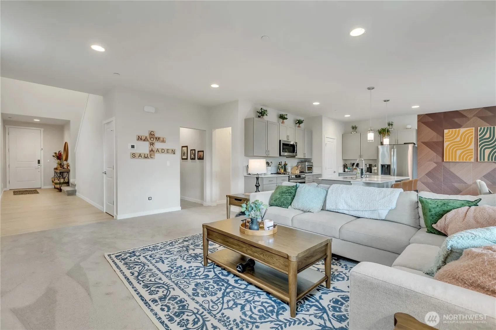 BEAUTIFUL & spacious FIVE bedroom Marysville home just like new! This 2 year old home has a fantastic layout, including soaring ceilings in the long, wide foyer as you enter, a main floor bedroom with a 3/4 bath ~ perfect for a home office OR guest suite! Open concept great room with 9’ceilings, kitchen has stainless steel appliances, a large island w/quartz countertops, eating bar & dining area with wood accent wall with lighting. Lots of counter space & a big pantry! Upstairs is a large bonus room, an office/desk nook, a huge primary bedroom & bath with double sinks, a soaking tub, walk-in shower, & pass-through walk-in closet that’s also connected to the laundry room! 3 more nicely sized bedrooms, plus another full bath, this 2600 SF home plan was thoughtfully designed. Covered front & back patios for year-round use, backyard is fully fenced & looks out to the community park with walking trails.