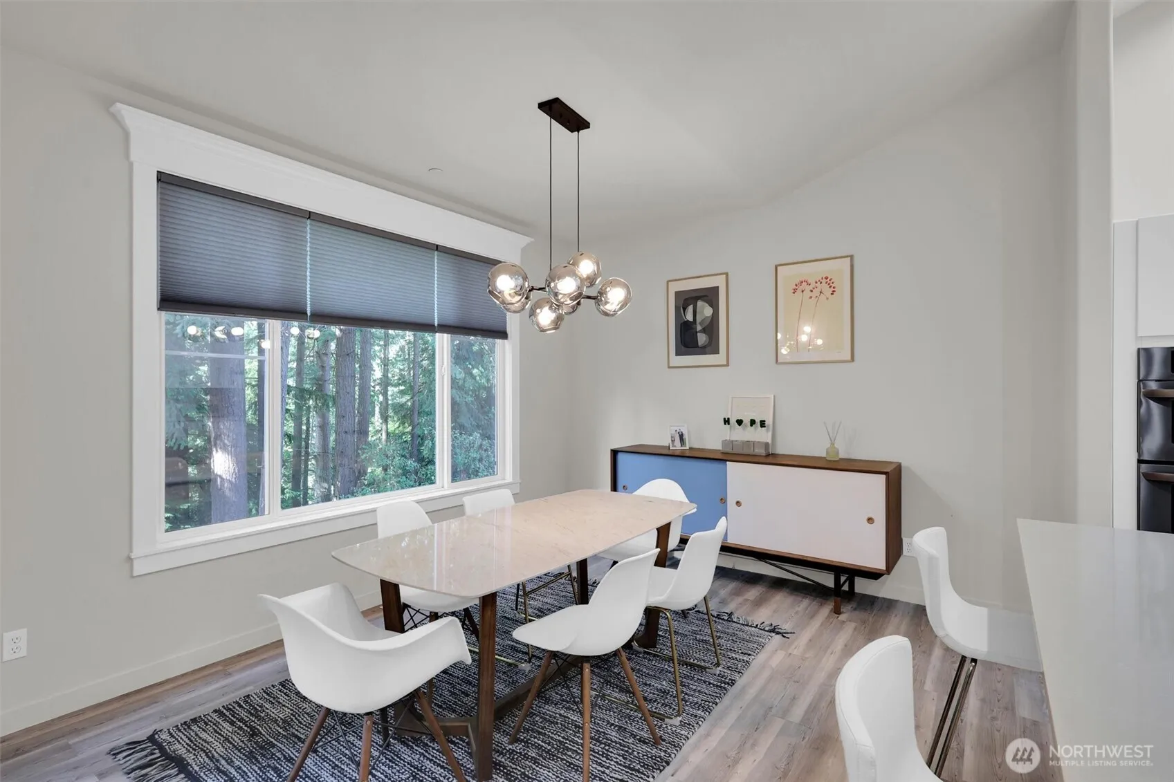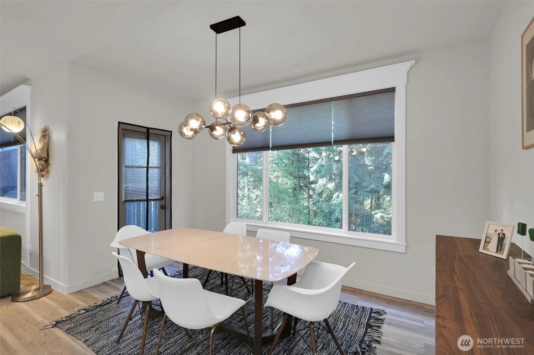 Charmingly updated townhome w/1484 sq ft of living space offers 3 bedrms and 2.25 baths w/open layout. Remodeled in 2021, Stylish kitchen features vaulted ceiling w/skylight, glossy cabinets, quartz counters, tile backsplash, SS appliances including microwave/oven combo, dishwasher, and induction range, plus engineered hardwood floors. Spacious living rm w/elegant gas fireplace and dining area opening to a private deck backing to greenbelt and tails. Primary suite includes remodeled bath w/double vanities, tiled glass dr shower. Main and powder baths also remodeled. Newer roof and exterior paint(3 years ago). 2 car garage. Community amenities include 2 pools, athletic courts, and parks. Short walk to Yellow Lake. Top-rated Issaquah schools.