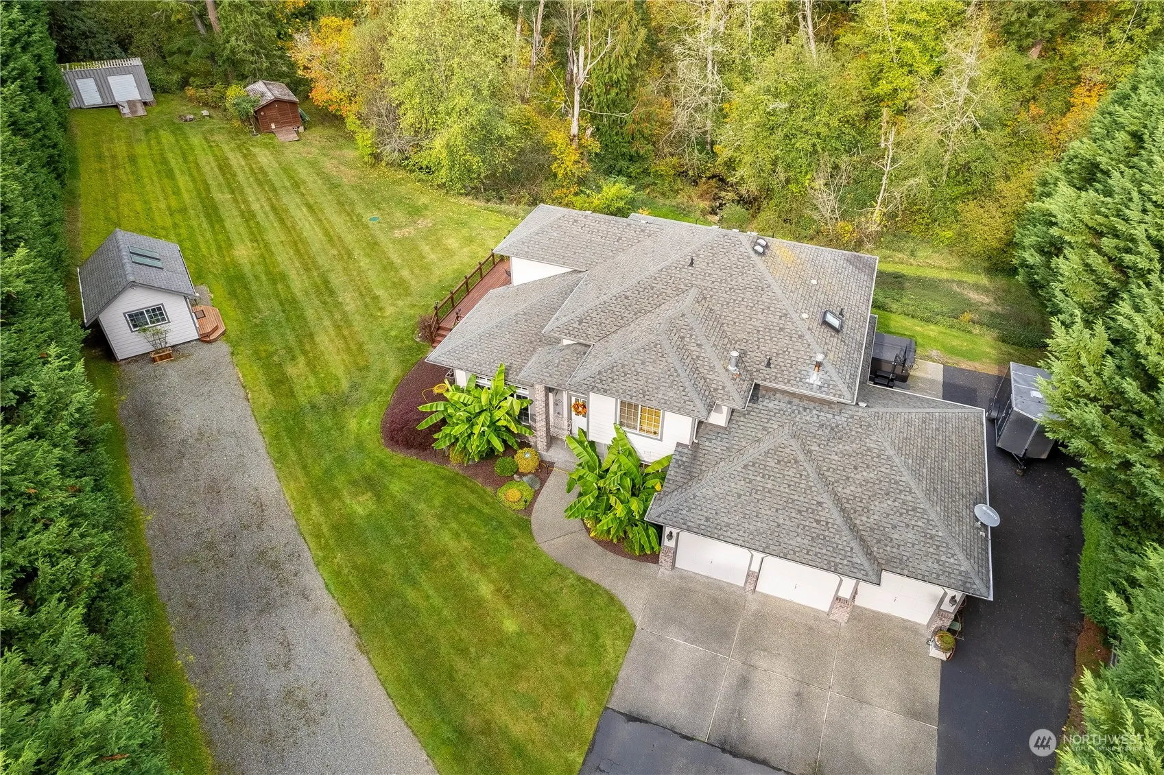 Beautifully maintained Maple Valley custom home on 3.81 acres. Park like setting, a salmon creek (Taylor Creek) runs through the property. Grand entry with Vaulted Ceilings, Hardwood floors, formal living and dining rooms, beautiful millwork and Marble gas fireplace. Updated open concept kitchen with slab granite counters, S/S appliances, breakfast nook, family room with 2nd gas F/P. Primary Suite has 3rd gas F/P, updated 5 piece en/suite with jetted tub and walk-in closet. + 3 more bedrooms and 2nd full bath. Expansive decks and patio for entertaining w/natural gas fire pit, BBQ, and smoker. Studio is fully finished with 2 lofts and heat. R/V parking w/30 amp power and sewer hookups. Storage container for outdoor toys, garden/ tool shed.