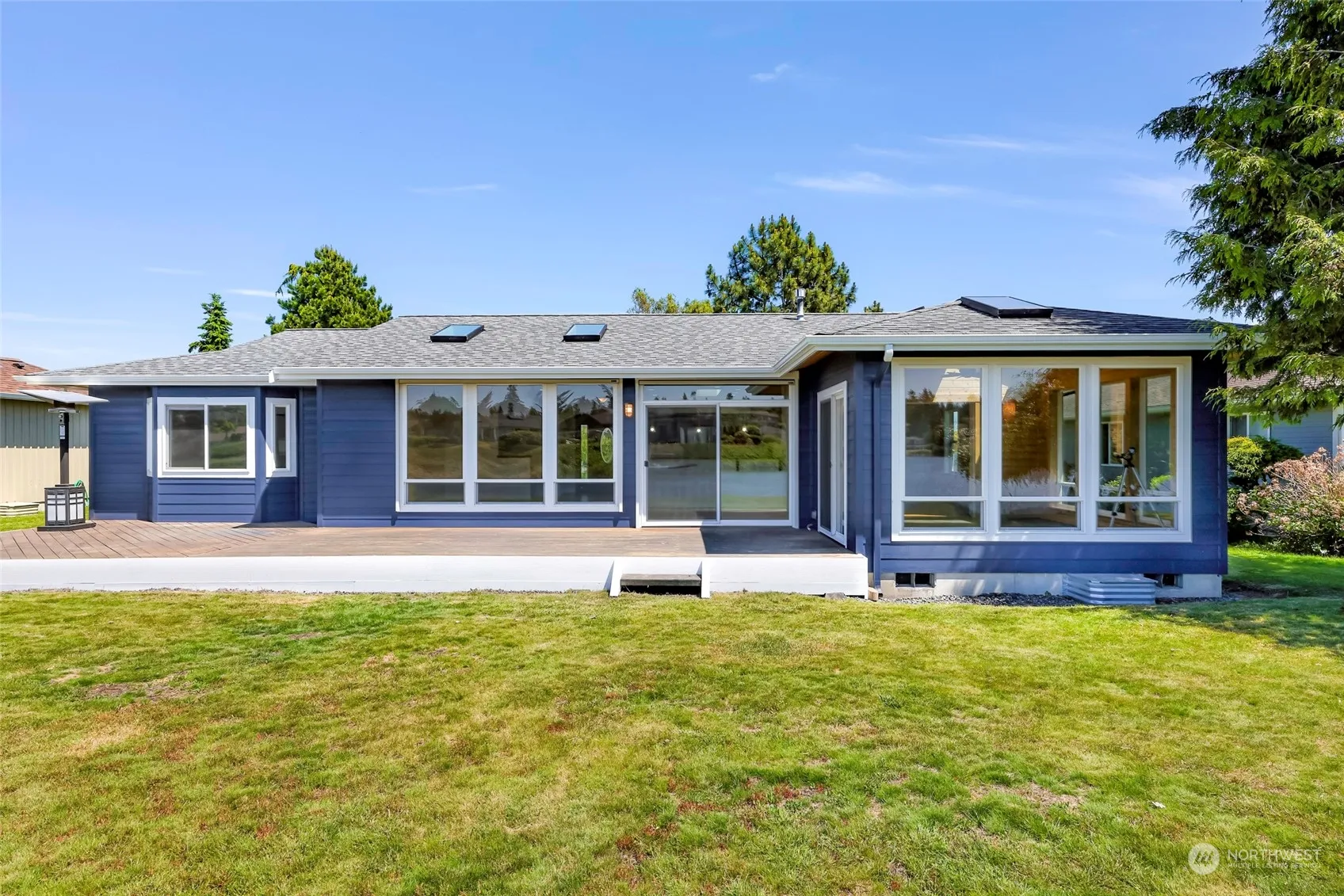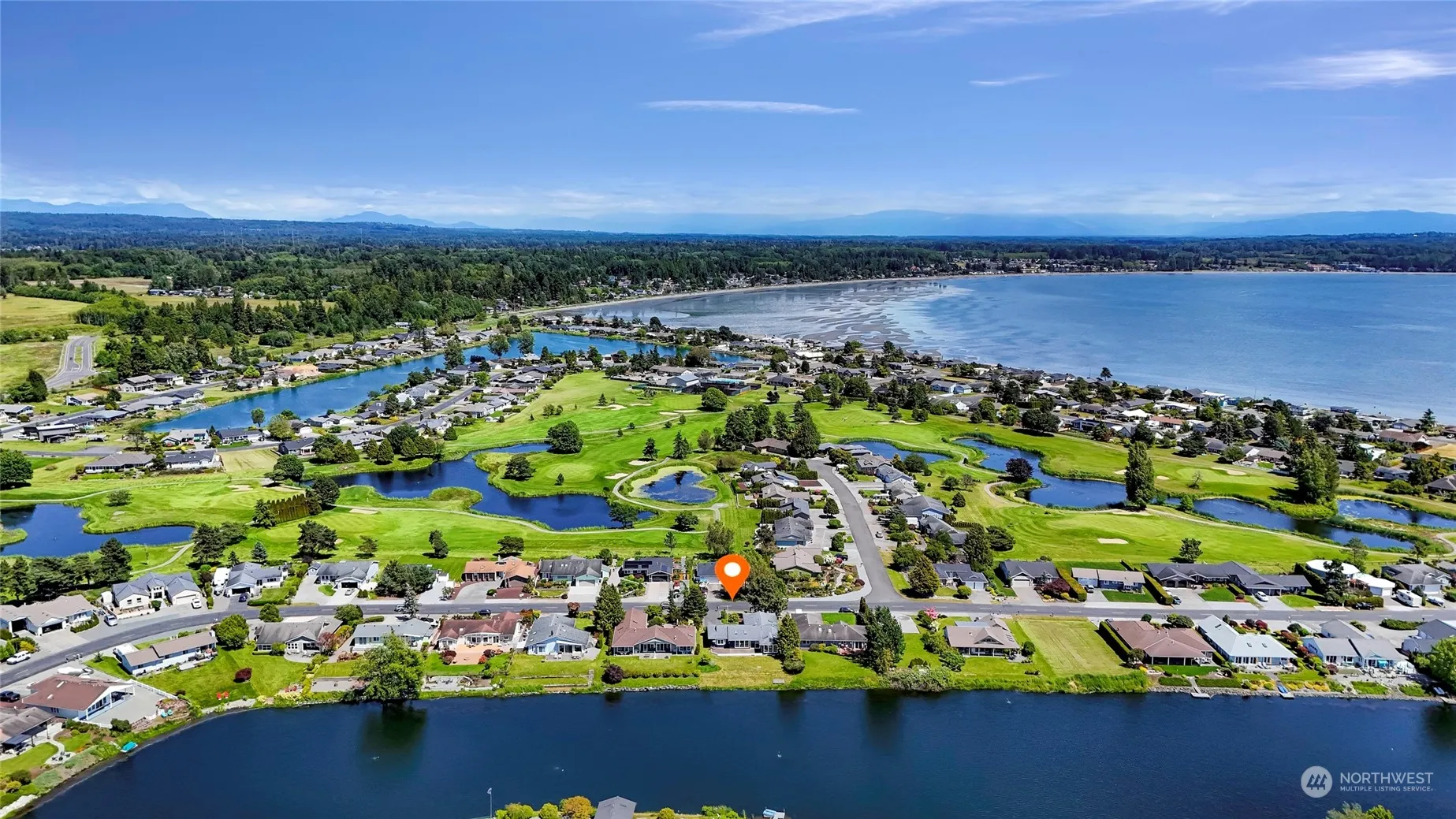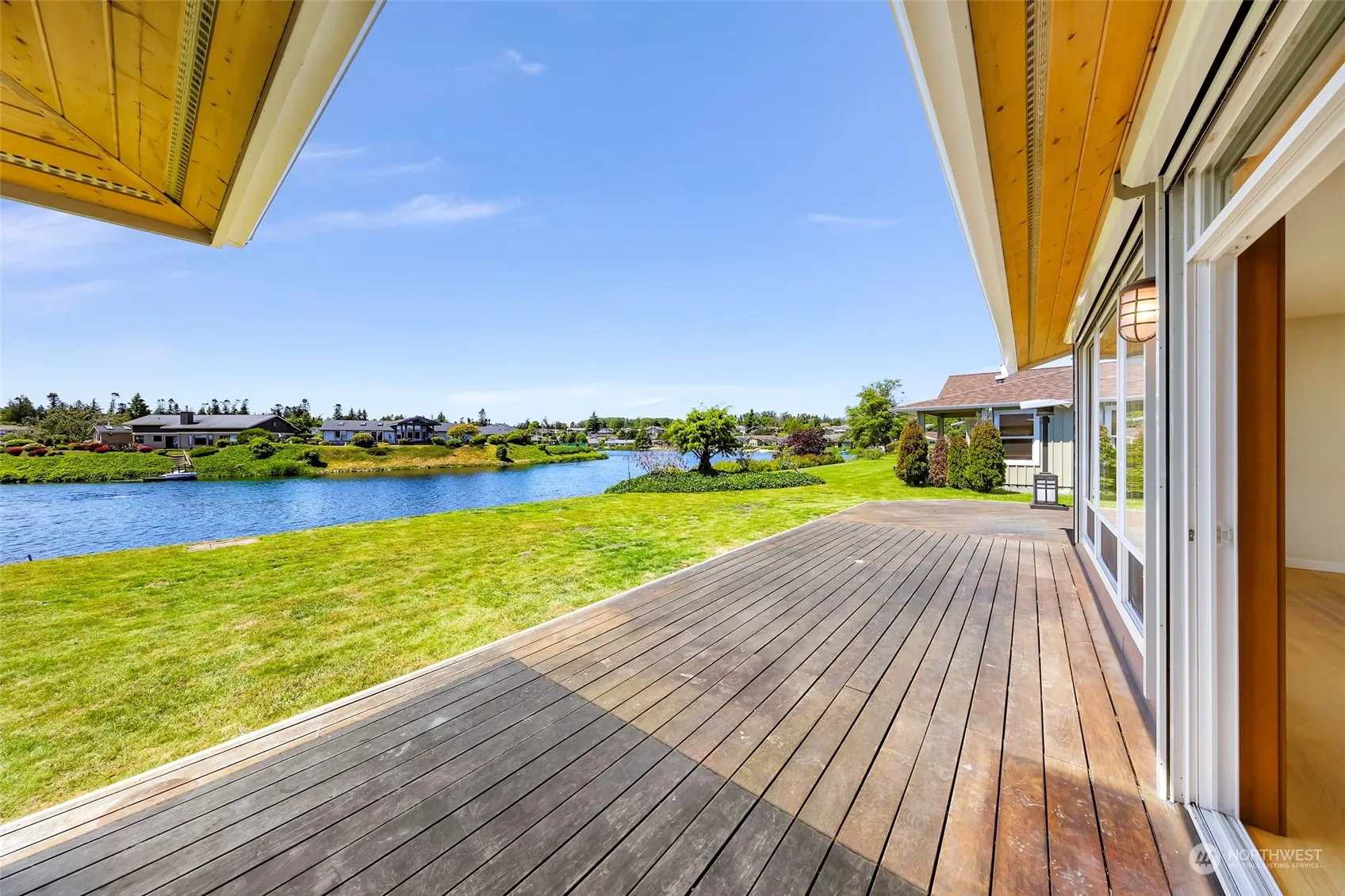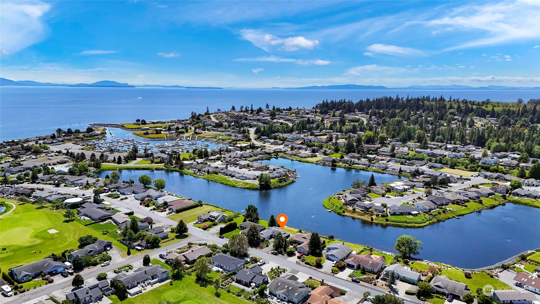 Come home to this beautiful waterfront single-level in Birch Bay Village! Enjoy your 75 feet of Thunderbird Lake frontage and views from your deck and most rooms in the home. New paint inside and out! The interior of the home is bathed in natural light with huge windows and skylights. Large great room/kitchen open up to tremendous views and right out to the deck. Sun room has massive windows and views; use as an office, yoga/art studio, library, etc. Enjoy the large primary suite and its gas fireplace/stove. Bring your boat and golf clubs! Birch Bay Village has 24/7 gated security w/ guard, pickleball & tennis courts, clubhouse, dog park, private Golf course, 250 slip marina, and community beachfront parks.