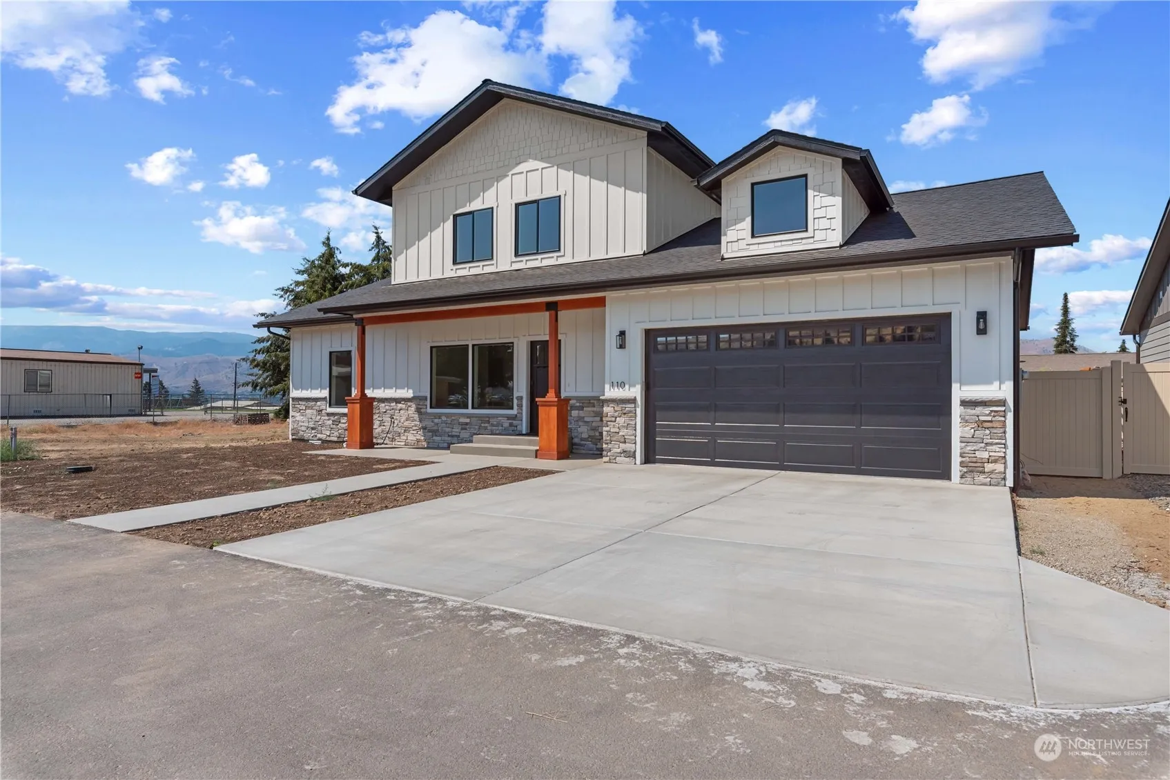 This charming new two-story with shake and stone finishes offers luxury and convenience. Brought to you by Trinity Builders. It features 9-foot ceilings, beam accents, luxury vinyl plank flooring and large picture windows. The kitchen includes a large island, quartz countertops, stainless steel appliances, a walk-in pantry and a convenient pot filler. The open and spacious great room provides lots of options for furniture placement. The primary suite offers a step-in tile shower, quartz counters, dual sinks, and a large walk-in closet. Upstairs, there are two bedrooms, a bathroom, and a bonus room. The back patio is perfect for entertaining, with a completely fenced backyard. The home is centrally located and offers serene mountain views.