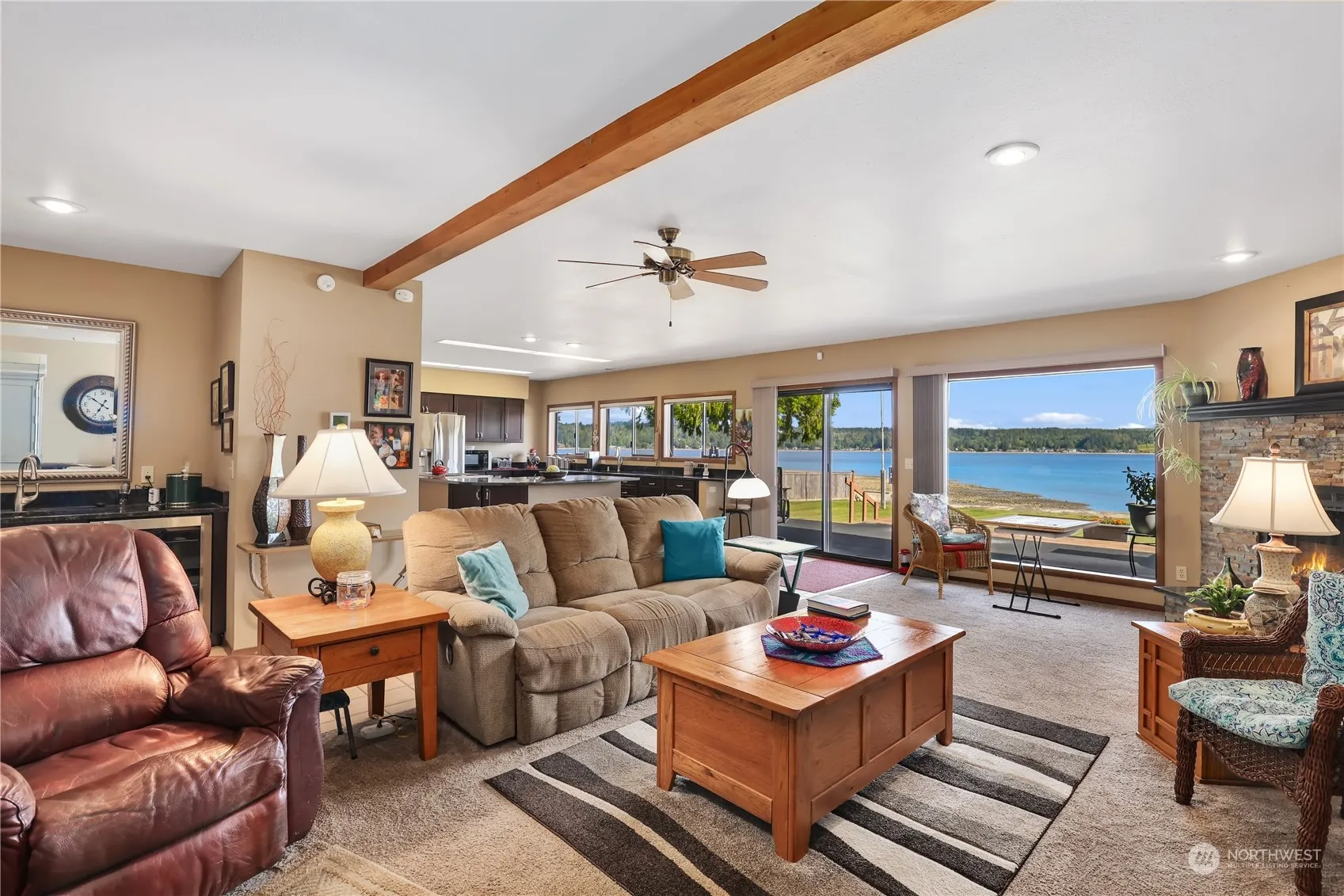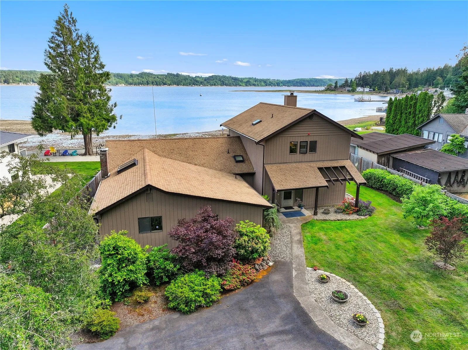 Enjoy sunrises from this magnificent No Bank waterfront home w/ highly desirable Southern exposure! This home opens to a sunny floorplan w/skylights + a wall of windows, adding an abundance of natural light thru-out. 2 Cozy FP’s + wet bar + wine cooler add ambiance for entertaining. Beautiful chef’s kitchen w/ SS appliances + pantry & large island w/cooktop + high end finishes. Main flr has two generous beds + 3/4 powder room renovated in 2020 + utility room. Upper level features spacious primary suite w/water views + private deck + 1 full bath + den//office. Backyard oasis featuring spacious beach front partially covered deck + beautifully maintained yard + newer roof. No bank 90″ waterfront w/tideland rights. Welcome home!
