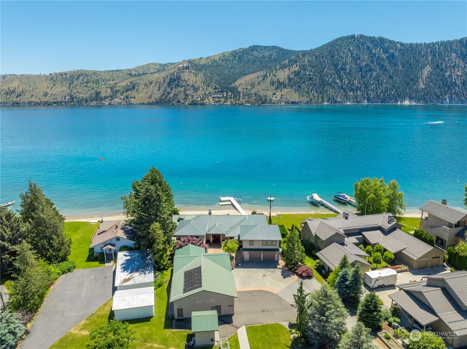Discover the pinnacle of Lake Chelan living at 358 Hyacinth Road in Manson. Situated on 1.48 immaculately landscaped acres, this 6 bed/4.5 bath home is ideal for you and your guests. Picture windows showcase the 115+ feet of no-bank sandy beach waterfront, complete with L-shaped dock, boat lift and 2 floating Jet Ski platforms. Host with ease thanks to the chef’s kitchen, wet bar and covered patio with BBQ. In the residence you’ll find the primary suite, 4 bedrooms and 3.5 baths. The bonus MIL apartment is complete with kitchen, bath, living room and lake views. Plenty of storage with an attached 2-car and detached 4-bay garage, complete with 3/4 bath right next to the swimming pool and fire pit. Close to everything, yet quiet and serene.