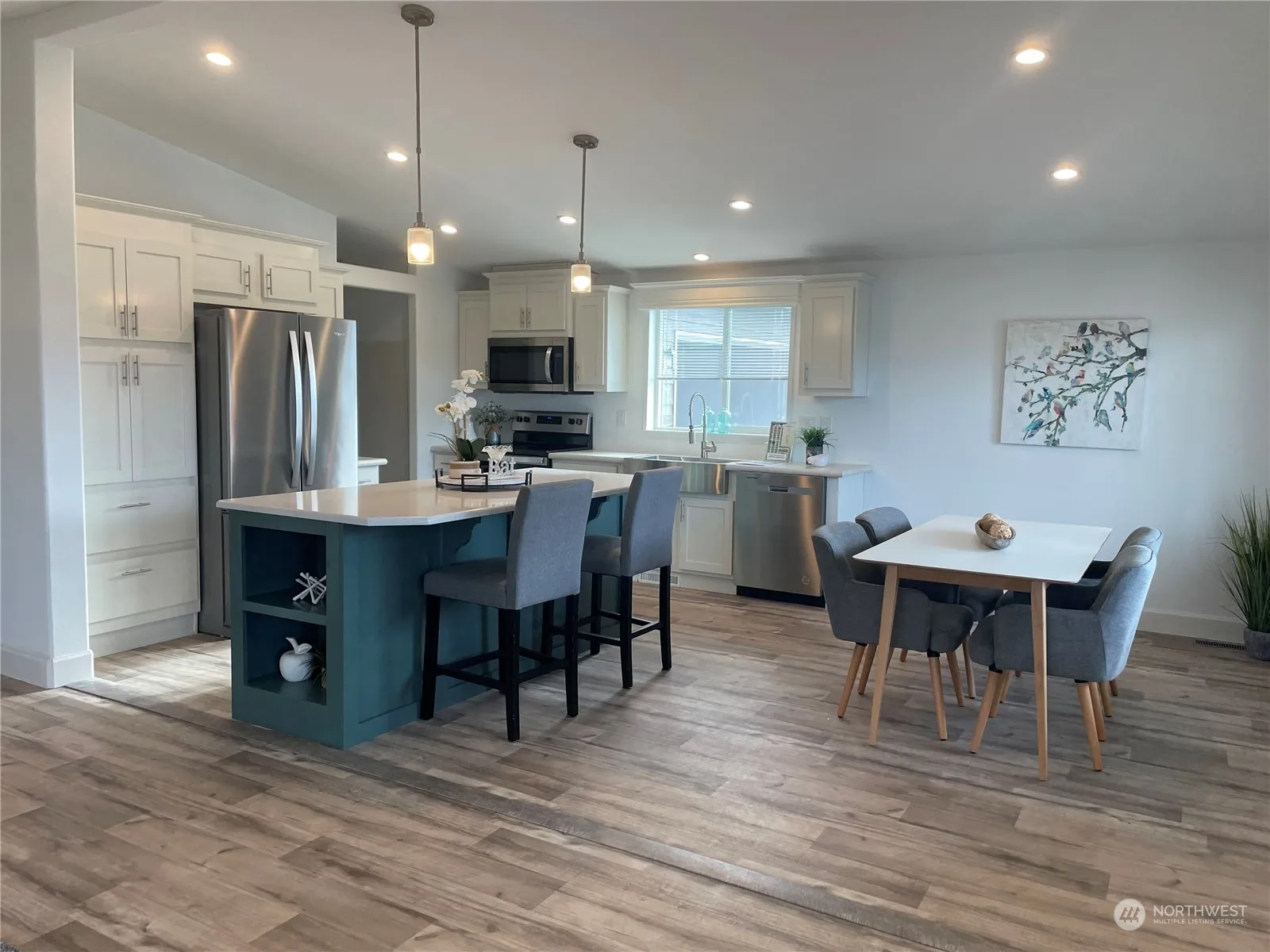 Explorer-Modern kitchen with quartz island, upgraded pendant lights, tile backsplash, Corian countertops & Stainless appliances. Open floor plan, corner fireplace, vinyl plank flooring and vaulted ceilings throughout. Primary bath has beautiful tile shower with glass barn doors. High efficiency furnace is heat pump compatible. Experience quality living in Lavender Meadows, a private, pet friendly, 55+ community located in beautiful downtown Sequim. Residents enjoy miles of level interior sidewalks, pickle ball courts, horseshoe pits, bocce ball, pocket parks, dog parks, and a clubhouse. Beautifully landscaped with irrigation and a 2-car garage. $3,000 buyer BONUS at time of closing!