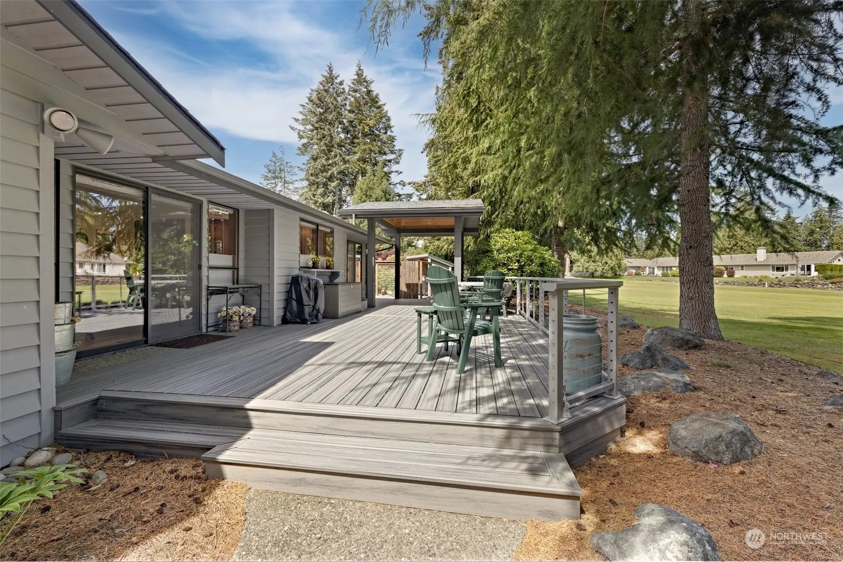 Desirable Sunland location! NEW upgrades throughout! Upscale PNW living near local beaches & trails. Private setting on nearly half acre w/ low maintenance native landscaping overlooking the 3rd green. Fruit trees, fenced garden space, new Trex deck w/ covered pergola. Stone patio w/ privacy fencing. 3 bedrooms, 3.5 bath & office/den. Separate entrance inside & out to 3rd bed/1 bath & kitchenette, w/ 2nd living room. Oak hardwood floors, new roof, skylights & insulation, new driveway & garage doors. New Rannai double tankless water heater w/ endless hot water. Plumbing, electrical & cable updated in 2020, & appliances. New walk-in tile showers & countertops in kitchen & bath. Propane free standing fireplace, electric blinds in main living.