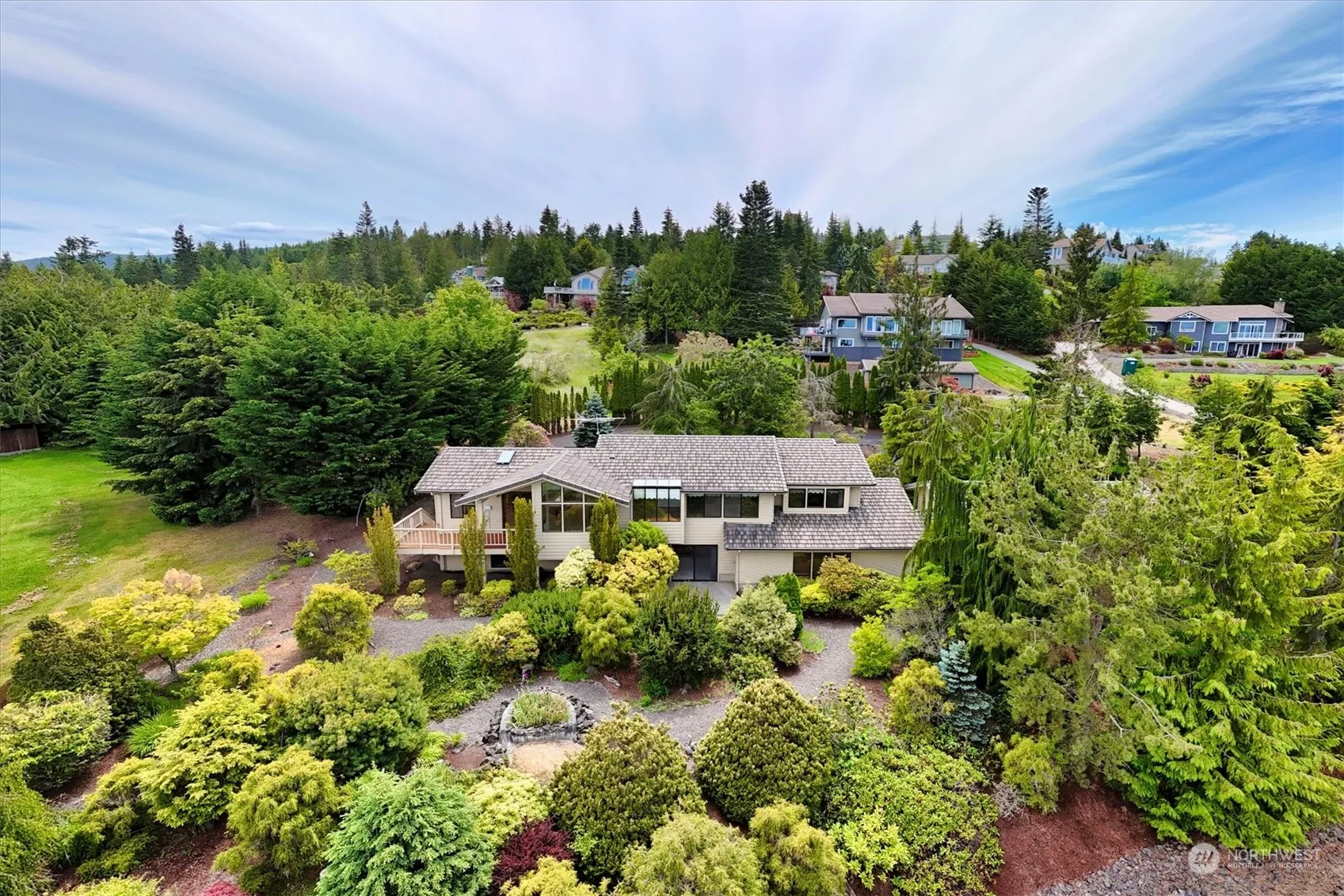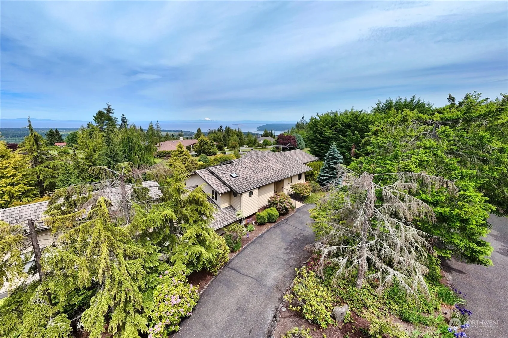 Waterview of Strait of Juan de Fuca & Mt. Baker from this 3290 sq. ft., 3 bedroom, 3 1/2 bath Bell Hill home on just over 1 fully landscaped acre. Main level has primary bedroom & full en-suite bath, Formal living/dining with vaulted ceiling, breakfast nook off kitchen, family room, 1/2 bath w/laundry & outdoor deck. Daylight basement has a 2nd family/rec room to private patio, kitchenette – perfect for multigenerational living, 2 bedrooms, 2 bathrooms and office/craft room. Amazing, large, 1597 sq. ft 3 car plus RV attached garage. Cul-de-sac location. Lots of built-ins throughout.