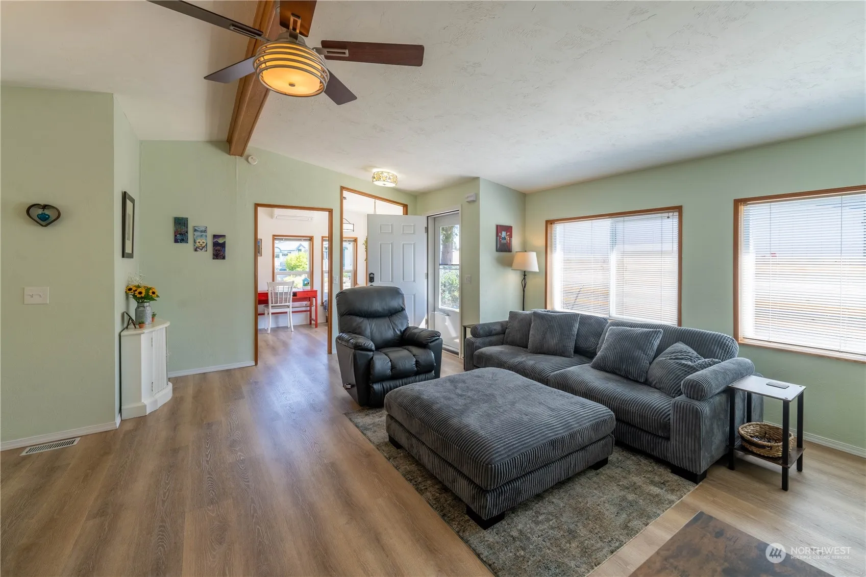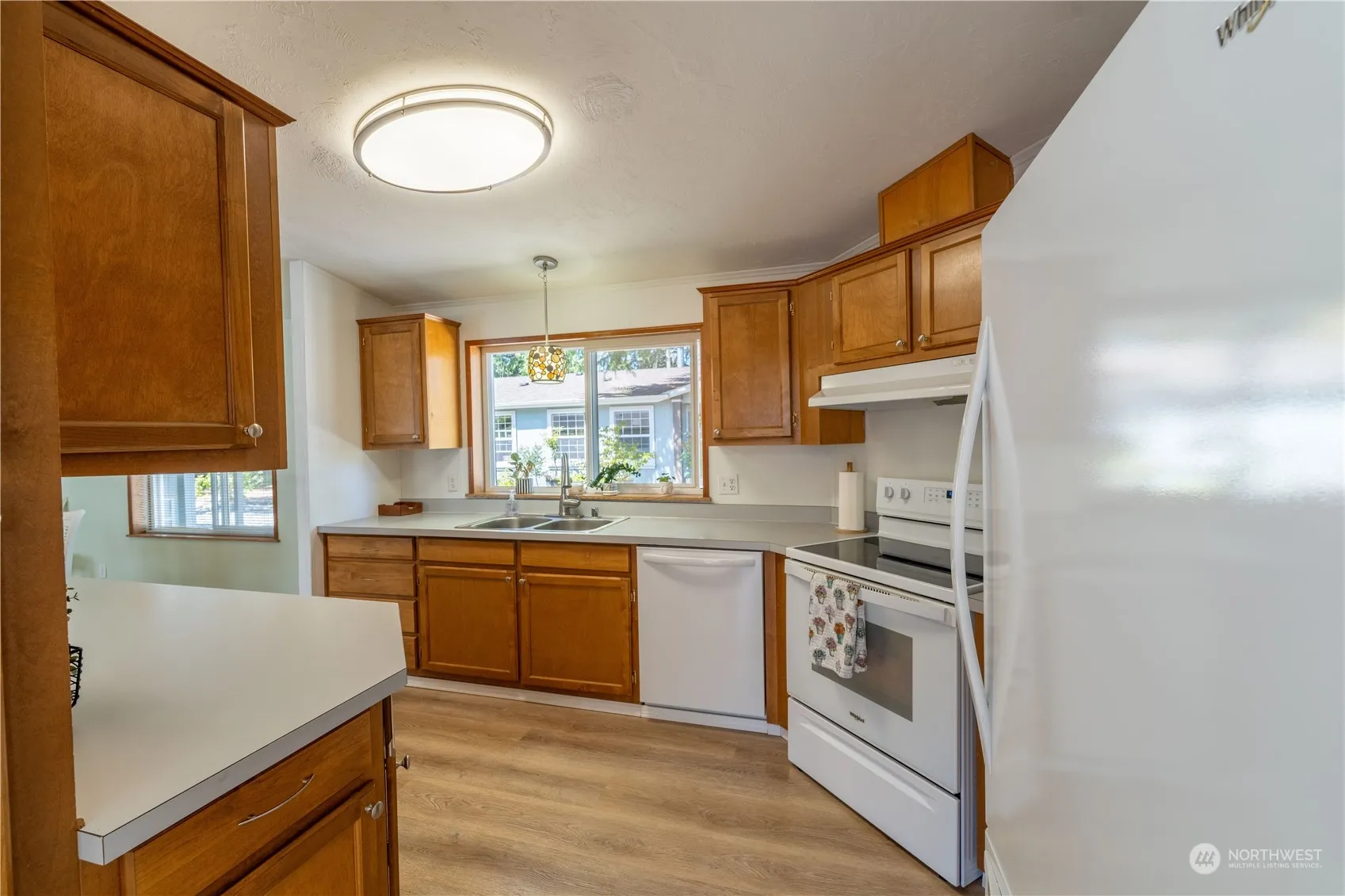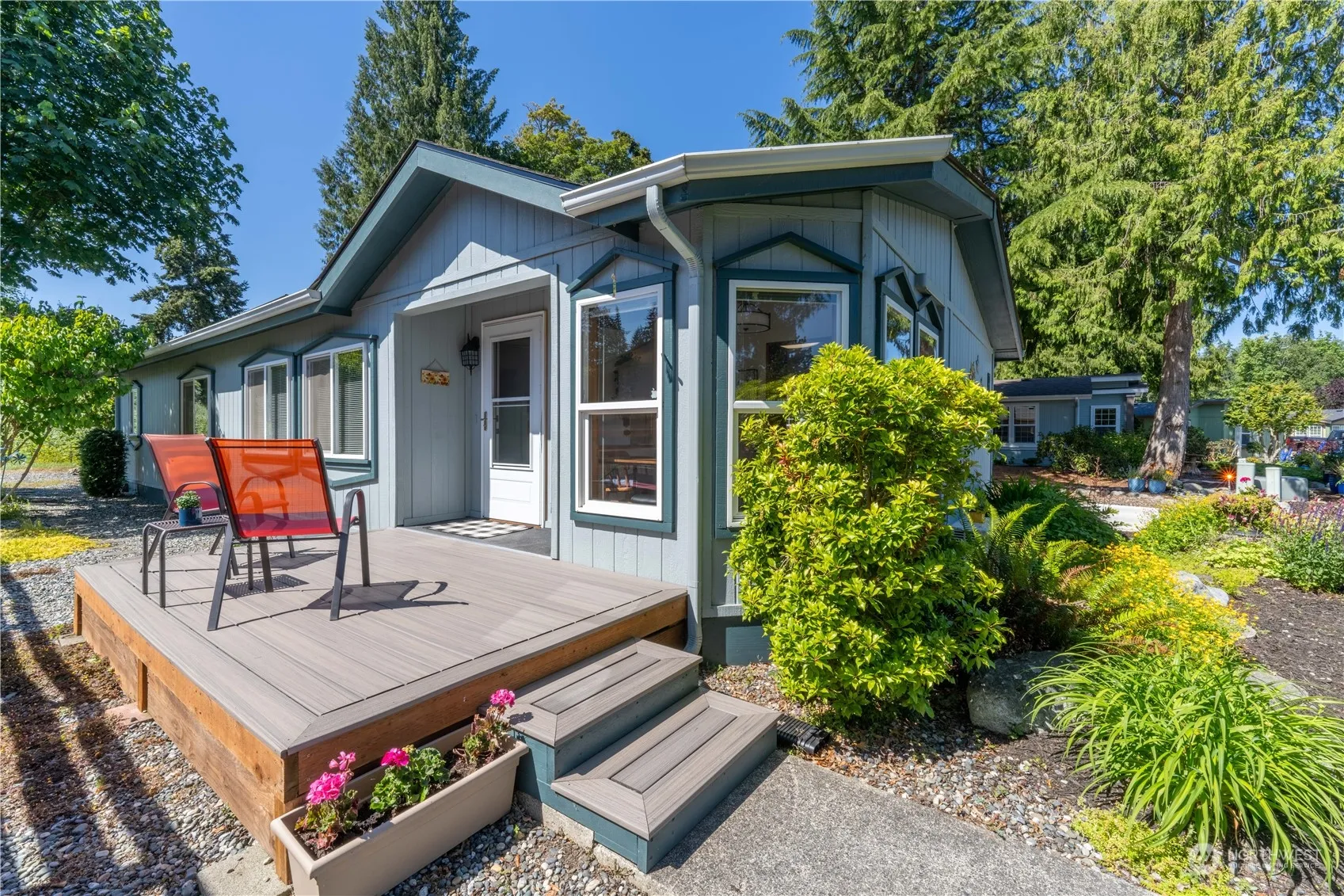 Lovingly maintained & nicely updated Parkwood 55+ home offers well-priced VALUE. Recent updates include newer vinyl plank flooring throughout (2020), newer appliances (2019/2024), heat pump (2018), interior paint, new composite deck (2023), and more. Two spacious bedrooms each w/walk-in closet & two FULL baths. This nicely landscaped home backs up to the greenbelt- watch for deer! Covered parking & exterior storage. Fantastic location- close to Sequim, Costco, medical, & restaurants.
