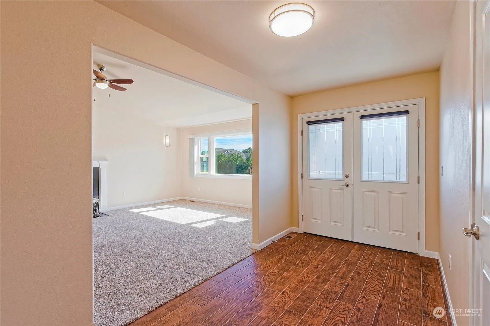 An immaculate home welcomes you thru the beautiful double-door entrance! Open-concept layout is filled w/natural light, thanks to the east-west facing windows & skylights. Great room boasts propane fireplace, ceiling fan & cozy carpet. Cook’s dream kitchen w/ample granite countertops, closet pantry & French Doors to the patio are all defined by the durable wood-look ceramic plank flooring. Primary on-suite w/ double vanities feature a one-piece toilet with a self-rising lid & recirculating hot water for added convenience. Lg garage allows for a work area. Includes a near-silent garage door opener, & 50amp EV charging outlet. Drip irrigation & minimal yard maintenance, this move-in-ready home is the perfect blend of comfort & functionality.