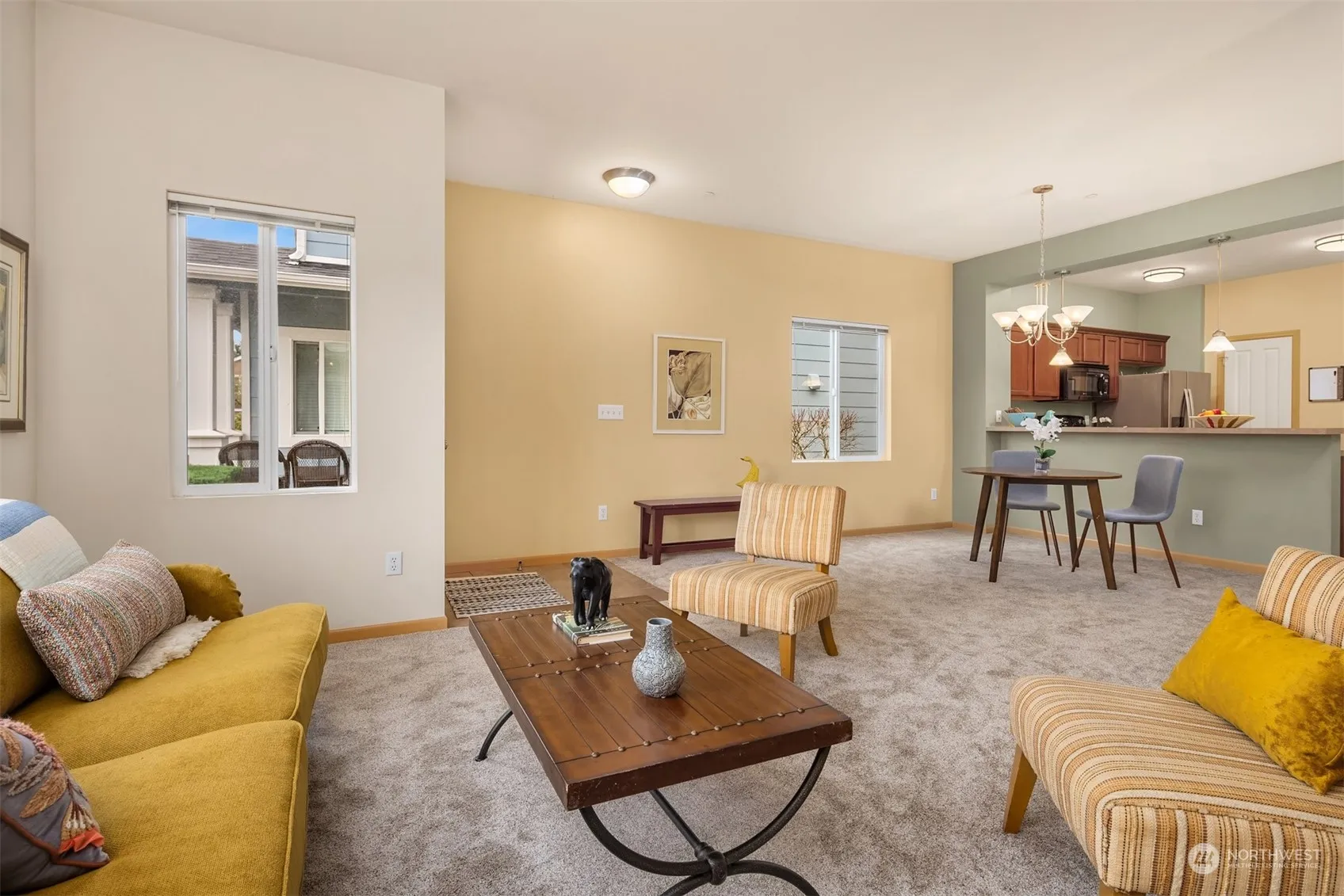 Perfectly situated and maintained condo in desirable Horizon Pointe community. So close to schools, parks, shopping, Capitol City golf course and Chambers Lake park, the unit features a generous open concept great room with spacious kitchen, walk-in pantry, 1/2 bath on the main and two en-suite bedrooms upstairs with walk-in closets and laundry in hallway. One car garage, driveway parking and guest parking within sight. Fresh paint and all new carpet — the place is ready for you! This is a fantastic opportunity to live a life of ease and comfort!
