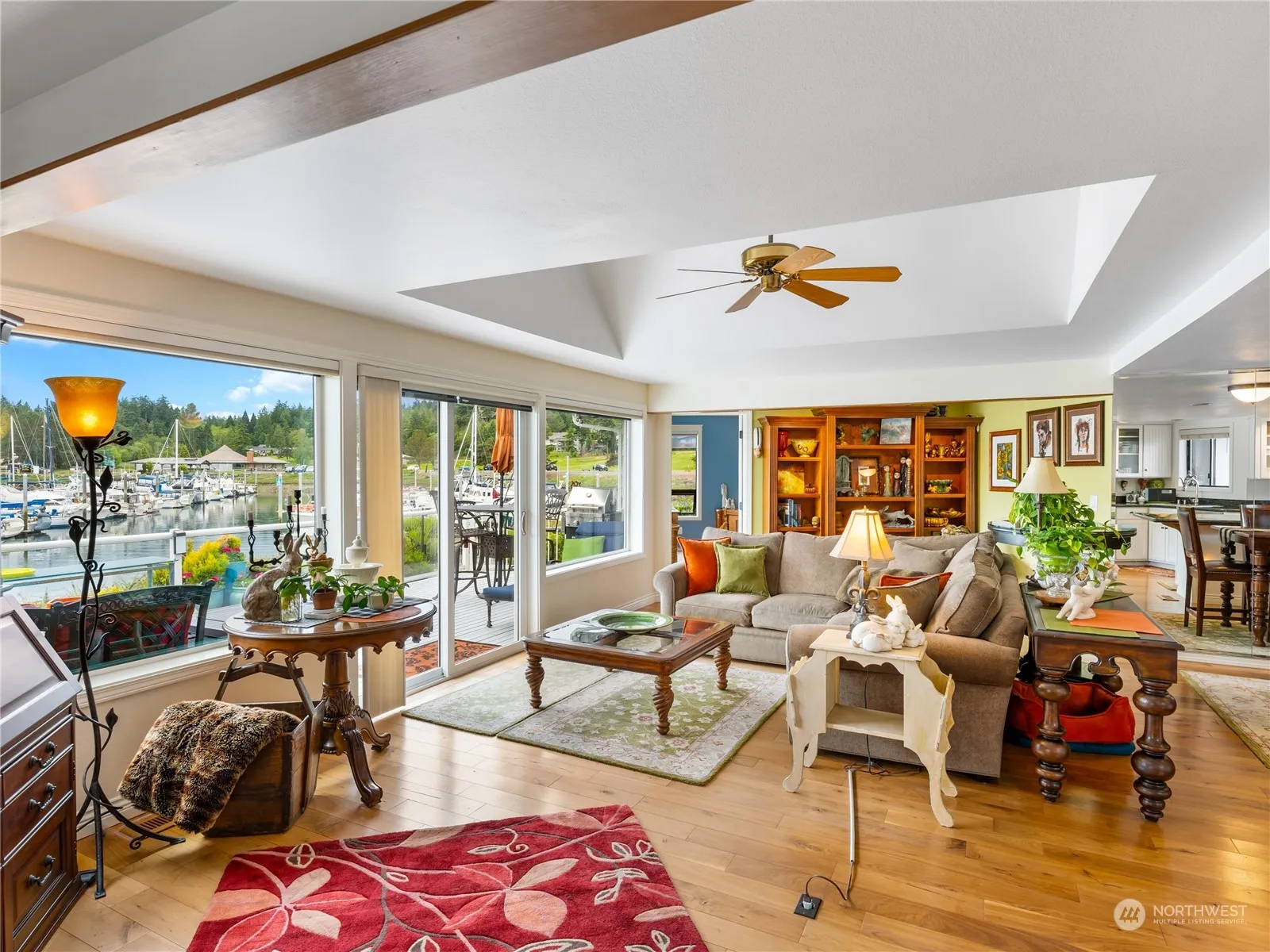 Nestled on the canal with marina, mountain, and golf course vistas, this home boasts stunning landscapes adorned with mature plants and winding walkways, offering a serene oasis. Picture windows frame stunning views from nearly every room, bathing the home with natural light and inviting nature indoors. Enjoy the seamless flow of the open-concept layout, featuring hardwood floors throughout the living, dining, and kitchen areas, perfect for effortless entertaining. Relax by the cozy fireplace in the family room, or step outside onto the spacious deck to soak in the panoramic scenery, creating moments of tranquility and connection with nature. Shelter Bay amenities include marinas, sports courts, 3 par golf course, beach access & a pool!