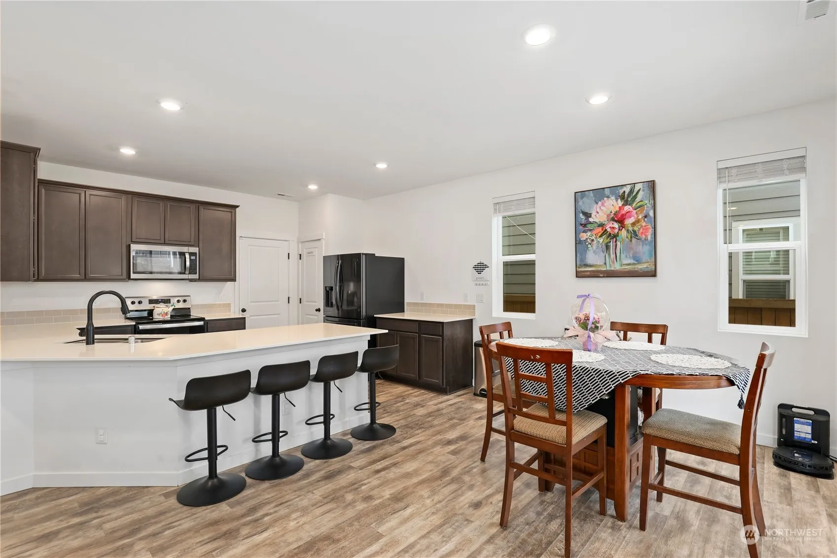 Discover modern elegance in this pristine 3-bedroom, 2.5-bathroom residence, 2021 build date and meticulous upkeep. Step inside to a stunning interior adorned with LVP flooring throughout the main floor, accentuated by 9-foot ceilings that create an airy ambiance flooded with natural light, dream kitchen, features stainless steel appliances and exquisite quartz countertops, lots of storage space, and a 2 car attached garage. Fully fenced backyard with a great covered patio! Located on a quiet street, close to a playground and many amenities, I-5, and JBLM.