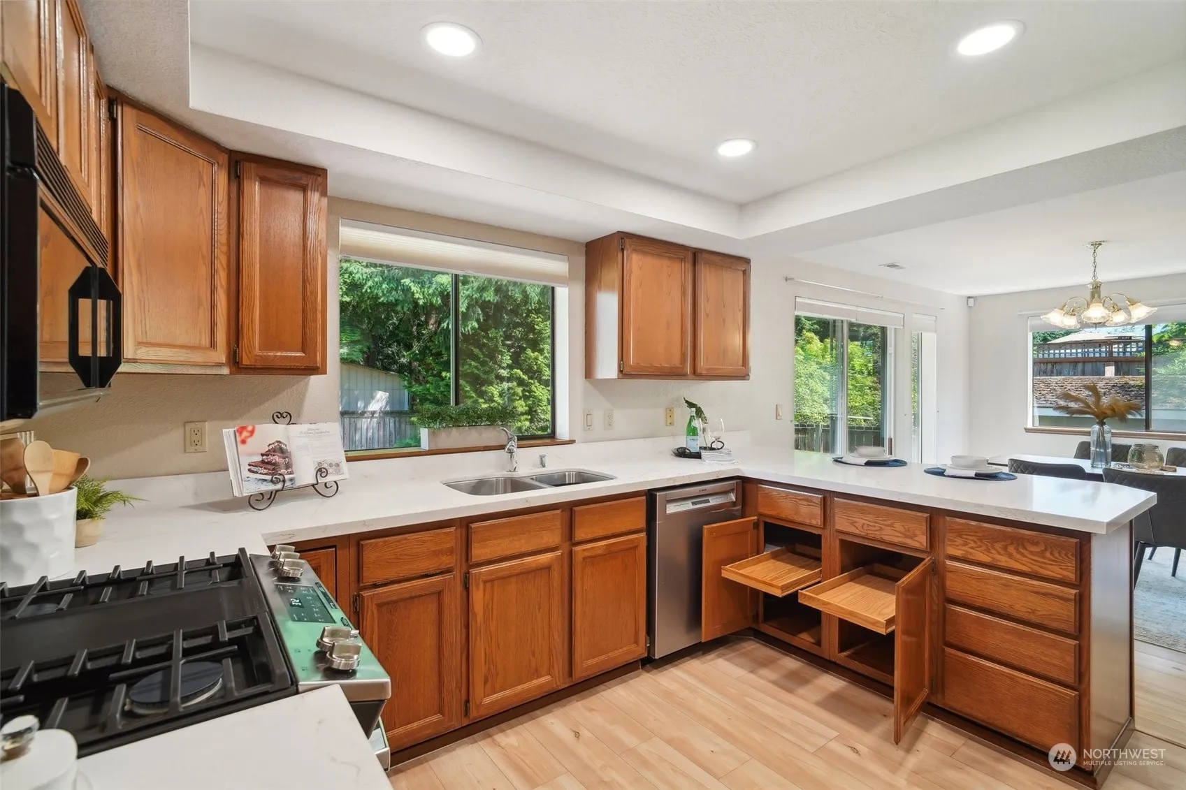Living is Easy in this Updated 3BR/1.75BA single-story home in desirable Mill Creek! Spacious floor plan w/Primary En-Suite & Secondary BRs at one end & Living/Dining at other! Soaring Vaulted LR Ceiling w/Wood Accent Beam & Cathedral Windows make Sunken LR bright! The Updated Kitchen features Stunning New Quartz Counters, New LVP, & Newer Appliances – sure to please the Cook! Easy care LVP continues in casual Dining Area & Large Rec-Room w/Wood-Burning FP. Formal Dining Rm opens to a Large Entertaining Deck w/Built-in Seating overlooking fenced, private backyard. 2 Car Garage w/Storage AND a Large Shop w/Power & Built-in Workbench! New Exterior Paint (2024), Heat Pump & Front yard Sprinkler System (2023).Close to Dining/Shopping. No HOA!