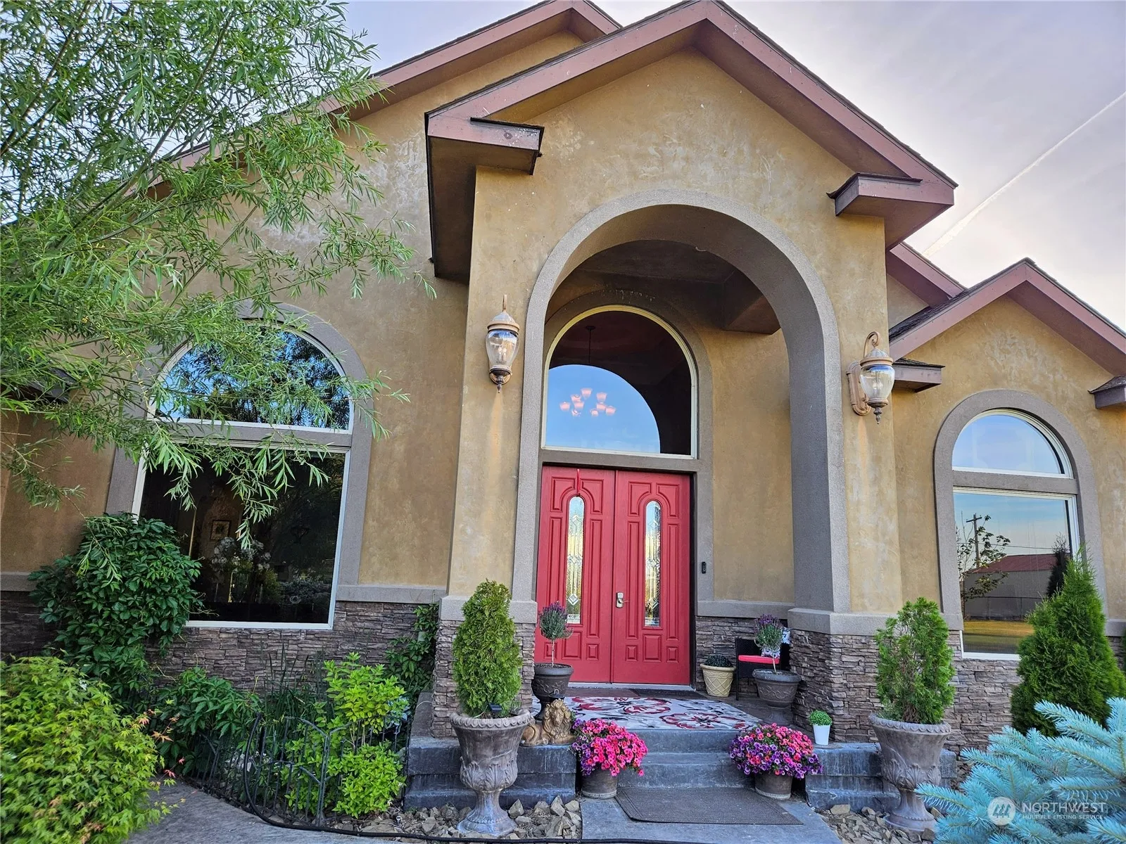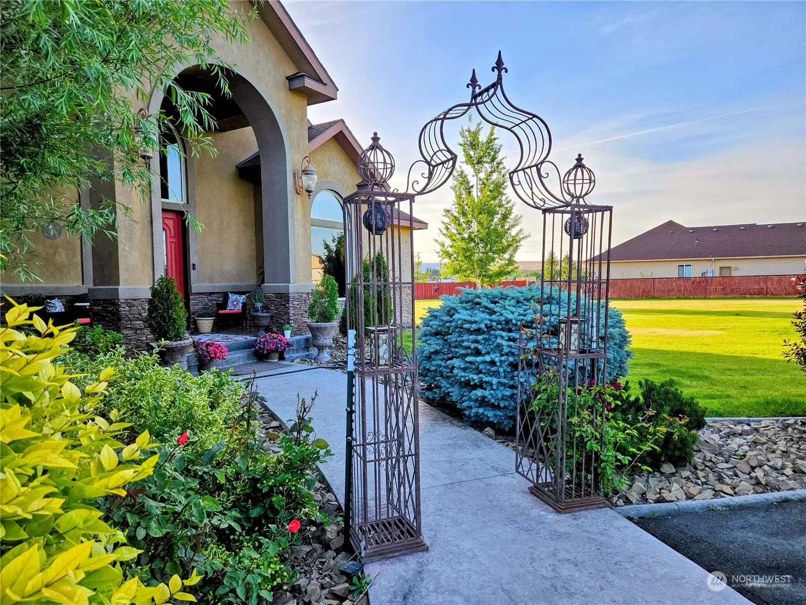 Custom Built and Beautifully Crafted Luxury Home. Perfectly situated on Five acres of carefully refined and irrigated equestrian pasture. Gated driveway opens into a fully paved loop driveway and an immaculate front lawn capable of accommodating large crowds for events and entertaining. Plenty of parking space available. High class interior decorating with high quality granite, rock, brick, natural wood and tile throughout the home. Enormous Primary Suite features a private entrance to the back patio and hot tub. Enjoy uninhibited views of sunrises with your coffee on the front porch and sunsets with your wine on the back patio. This home is the definition of Bliss and Serenity.