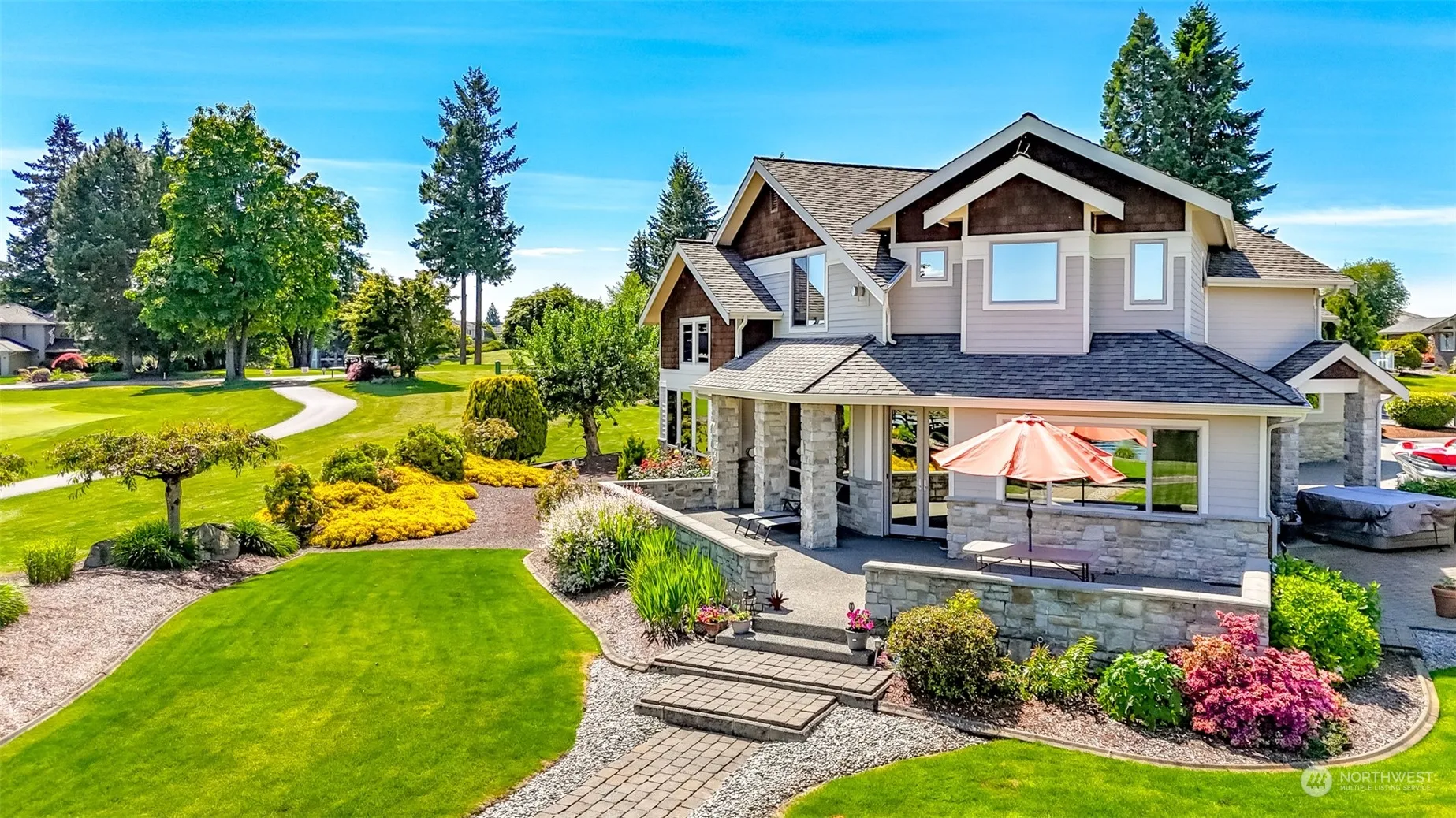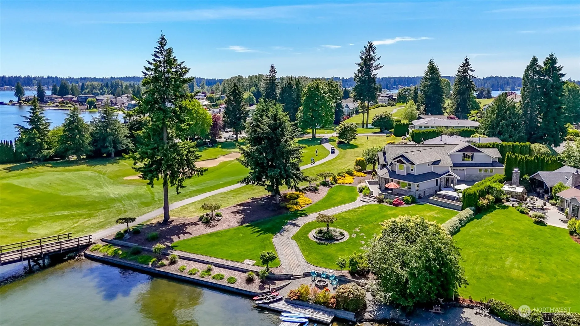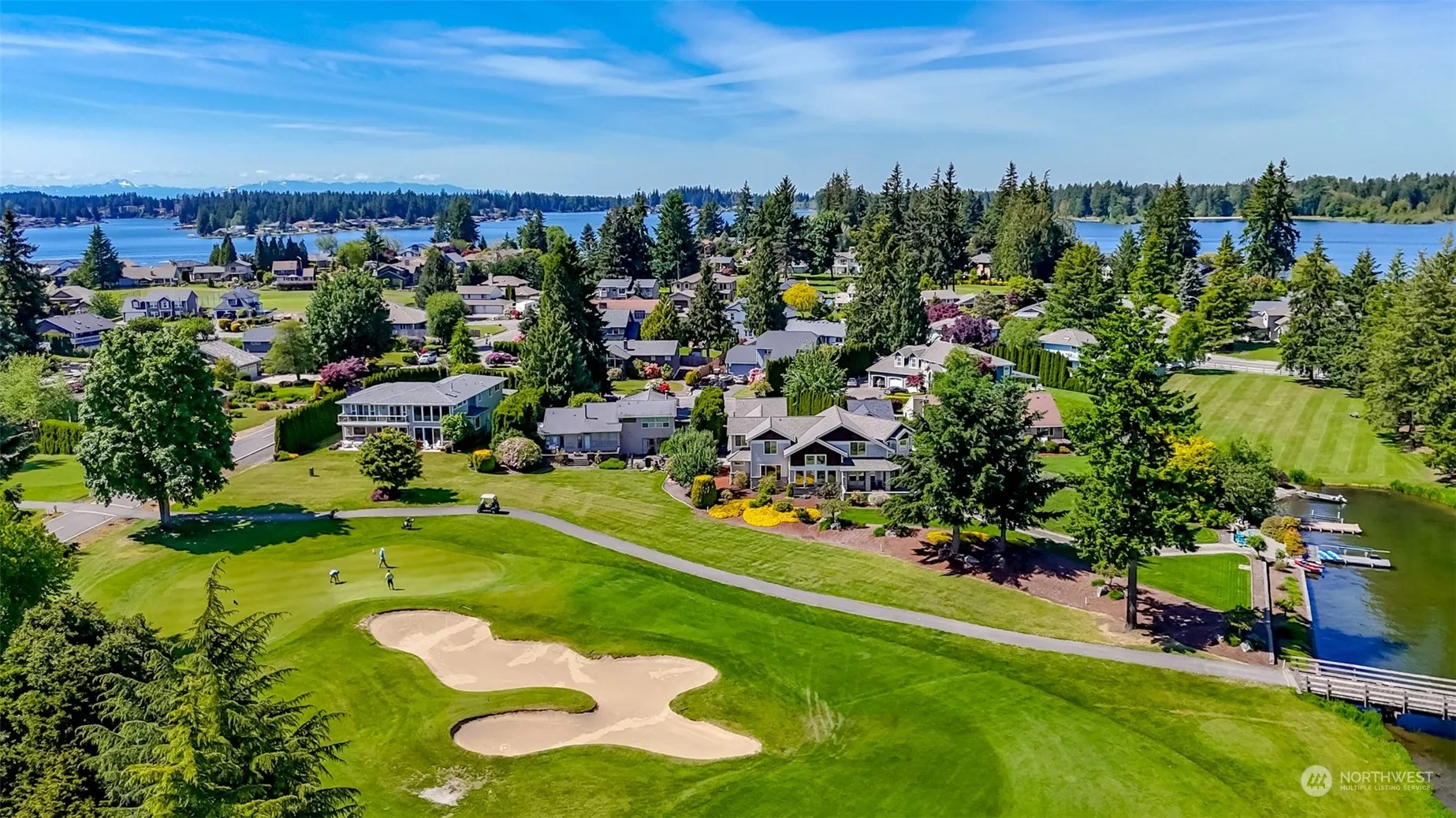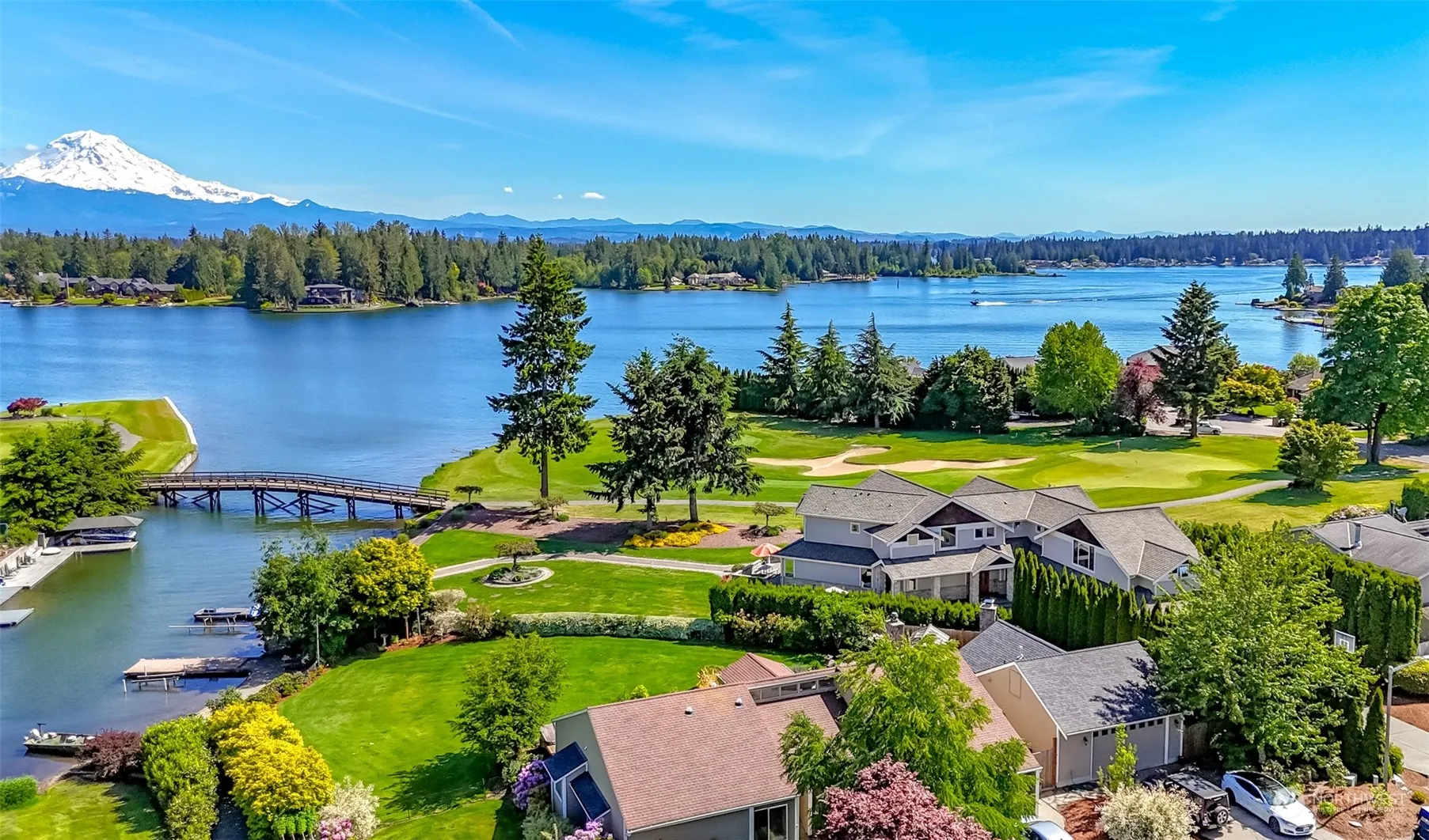 Tapps Island, 120 feet of no bank waterfront! First time on the market! Located on the 3rd green, views of Lake Tapps and unobstructed views of Mt. Rainier, this home has 4 bedrooms, 3 1/2 baths, great room with vaulted ceilings, game room with pool table, work out space, and wet bar. Also included, a sauna off the master bedroom, a swim spa, hot tub, extensive concrete decking and patios. 4 car tandem garage, golf cart access, EV hook-up and one of the largest best maintained lots on the island. Community golf course, clubhouse with pool and restaurant! Community boat launch, parking, tennis and pickleball, work out room and much more. 24 hour security. At seller’s request, no sign.