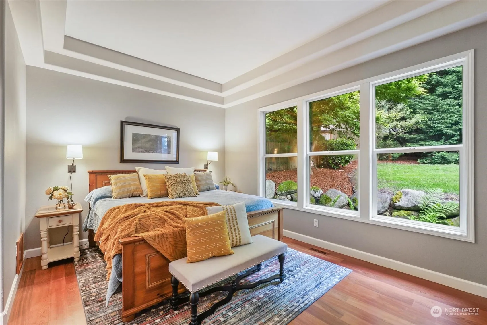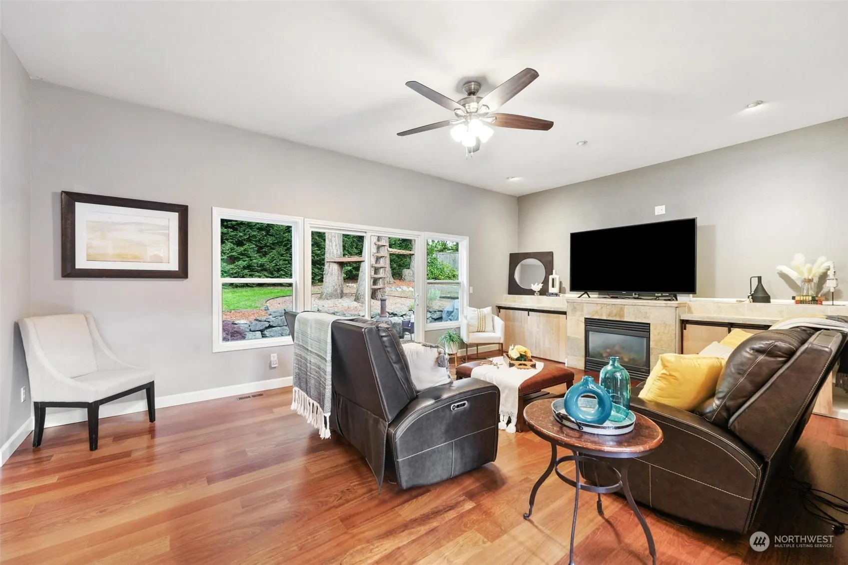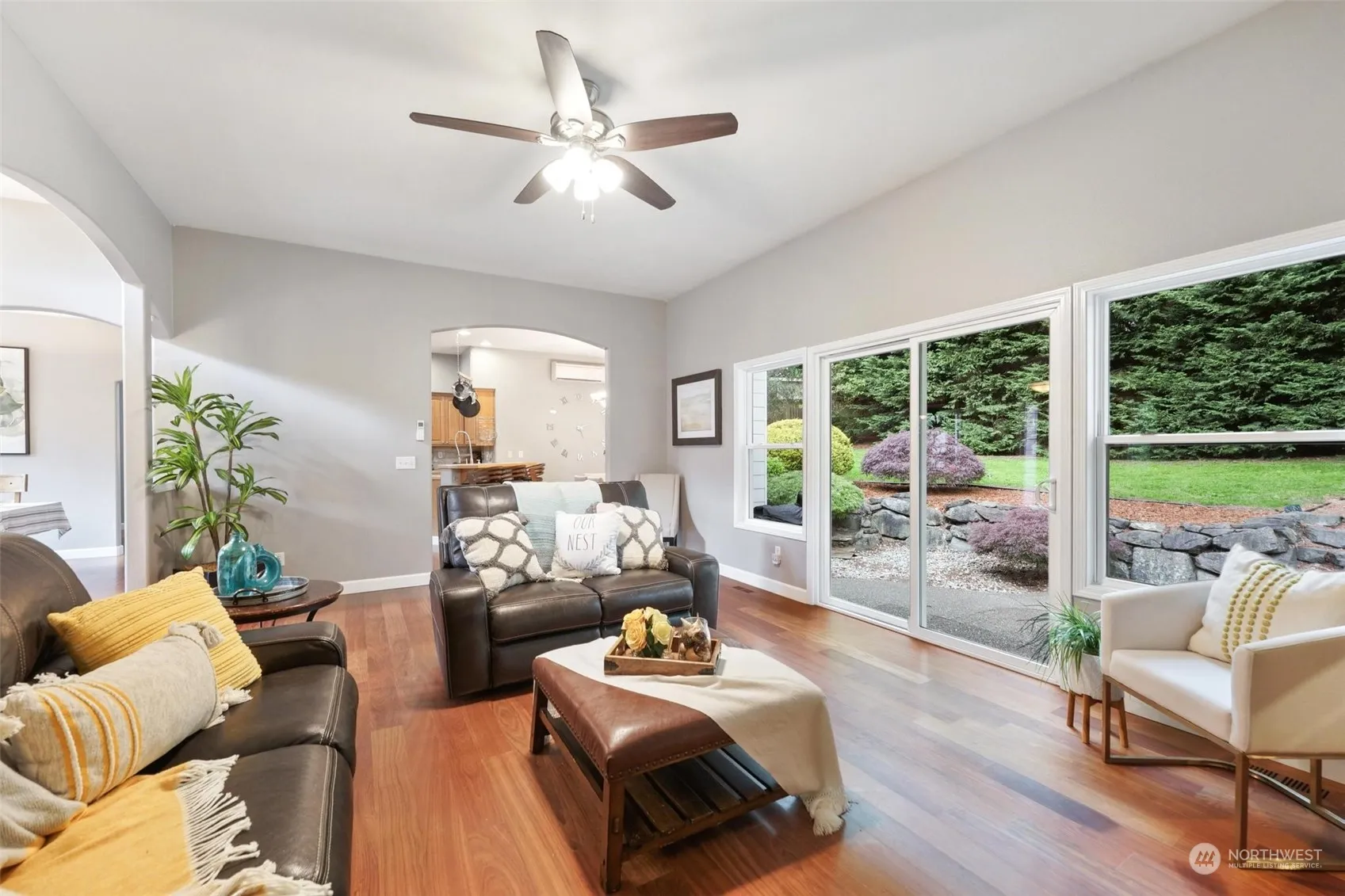 Expansive Brazilian hardwood floors invite you into this open and bright rambler. Tiered peninsular counter w/eating bar in open Kitchen large pantry, tile counters, & stainless appliances. Gas fireplace in Living rm. Form Dining features coffered ceilings. Well-appointed Primary Suite, finished w/tray ceiling & walk-in closet. Barn door opens to ensuite w/jetted tub & walk-in shower. Three guest bdrms (two sharing jack&jill bth), each w/their own ductless mini-split. Expansive upper level bonus rm. Sitting on shy half acre, fully fenced w/mature landscaping. Tucked away on corner lot in gated Grandview community, in highly sought after Dieringer School District. Moments from Lake Tapps; spend your summer on the water, swimming & boating.