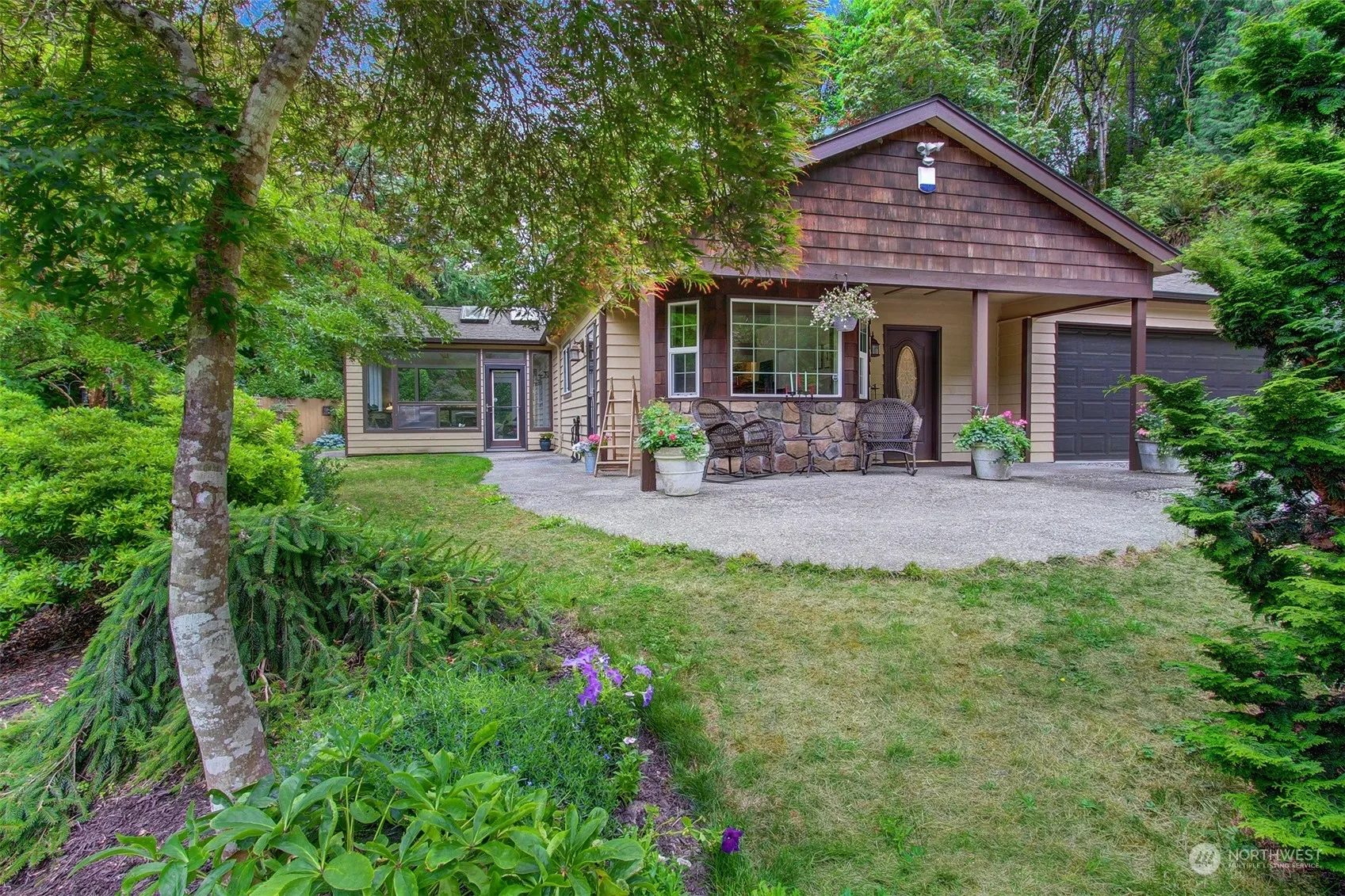 Charming Craftsman on 2.5 acres stunning acres. Open floor plan featuring a chef’s kitchen w/Hickory cabinets, Corian counters; a private primary suite upstairs with 5 piece bath; & a spacious sun room w/ wall to wall windows & cozy gas fireplace. This property is an exquisite gardener’s paradise w/lush & mature trees & plants, 3 cascading waterfalls w/ a stream running through, an idyllic gazebo w/ glider bench on the edge of a peaceful pond, wrap around patios & meandering pathways, & raised beds. Additional unattached garaged, a large level area currently used for parking w/ plenty of room to build a shop or barn, & outbuilding for storage. Enjoy endless summer nights entertaining or peacefully listening to the sounds of water & nature.