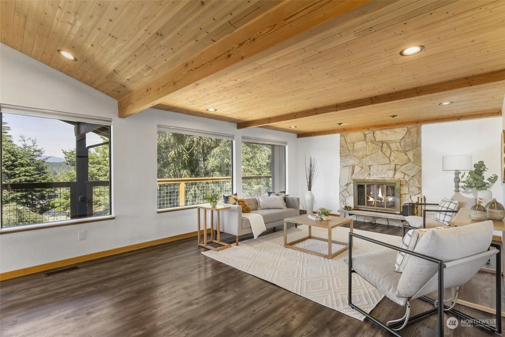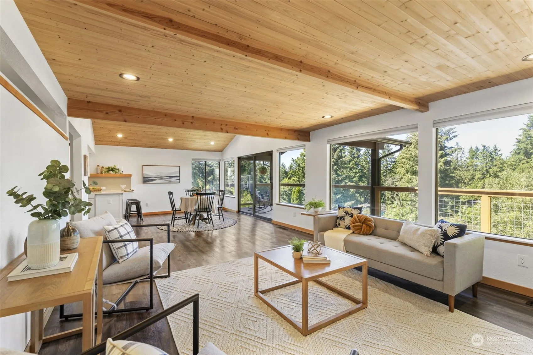 Updated 4-bedroom Poulsbo home with partial Olympic Mountain & Liberty Bay views! This 2,582 sqft property shines with new flooring, fixtures, paint, and more. Living and dining area with cedar plank ceilings, cozy fireplace, and access to the huge deck to enjoy the western sunsets. Modern kitchen with all new appliances, Quartz counters, soft close cabinets, and upgraded lighting features. It also offers remodeled bathrooms, closets with organizers, main level heat pump, and private basement living area with separate entrance. Newer roof, tankless water heater, gutters, and sprinkler system. Set on .32 acres with beautiful landscaping, attached 2-car garage, and 22’x24’ detached garage. Near dining, shopping, Navy Base and Seattle Ferries!
