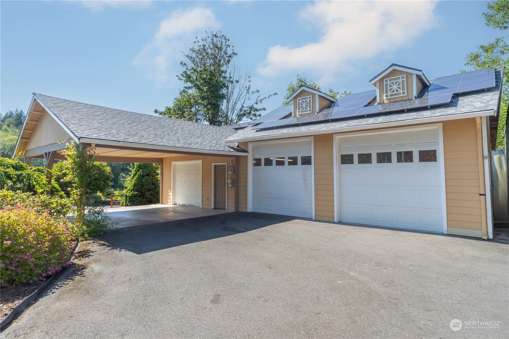 Enjoy country living close to Keyport! Tranquil territorial views overlooking pastureland from new trek deck with sunshade. Need garage space? Deep 3 car garage with tall door and raised ceiling for floor lift, concrete pad for RV or boat. Beautiful mature landscaping, patio with firepit and raised garden beds. Light filled 1850 SF home with unfinished basement. Open floor plan features solid wood doors, tile floors, 2 propane stoves, cedar wall and French door to deck. The primary on main floor has bath with large walk-in tile shower. Guest bath has walk-in jetted tub. New garage roof, windows on main floor, water heater & furnace. 10 stall dog kennel, concrete floors, heated indoor space and fenced area.
