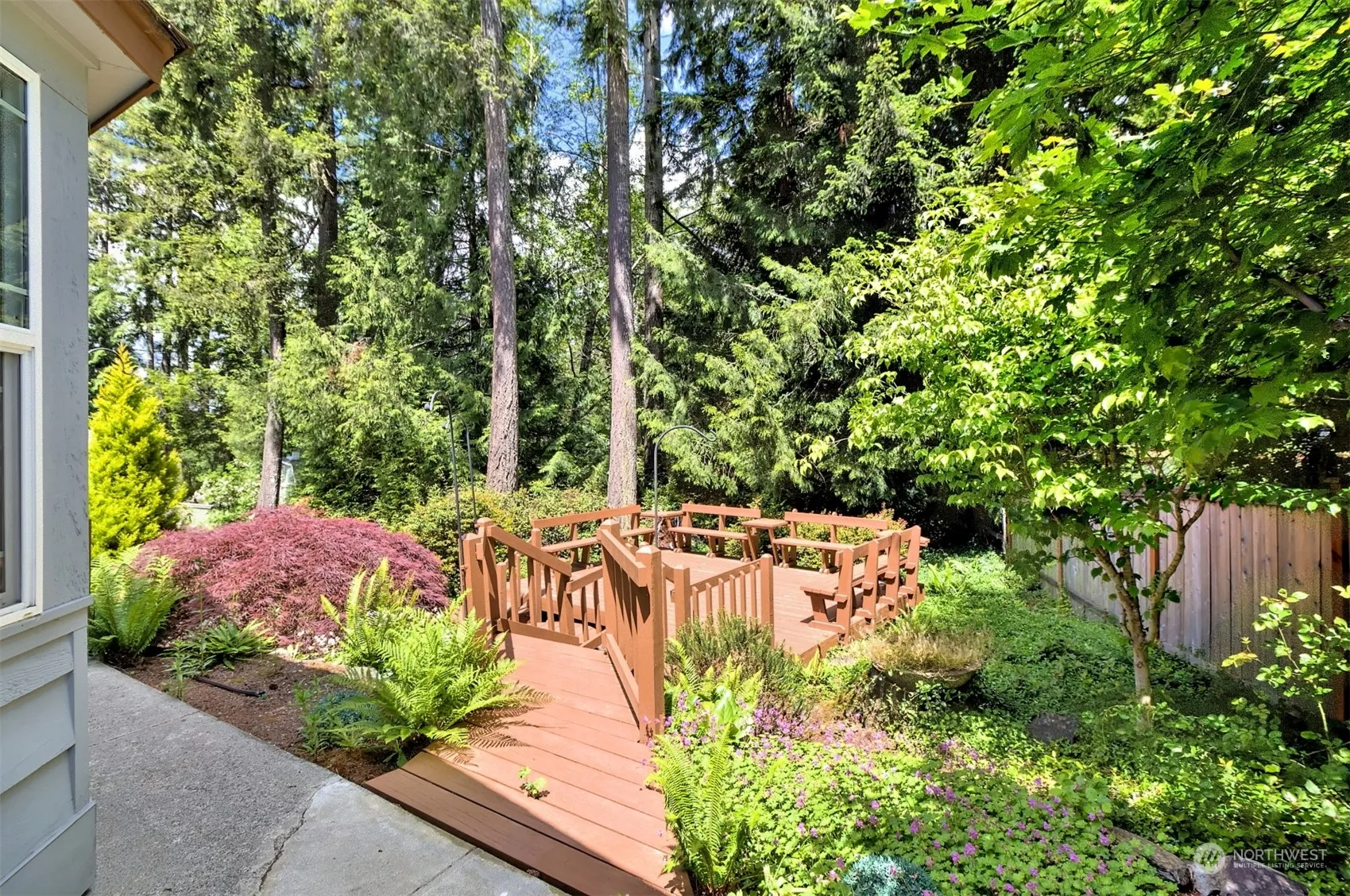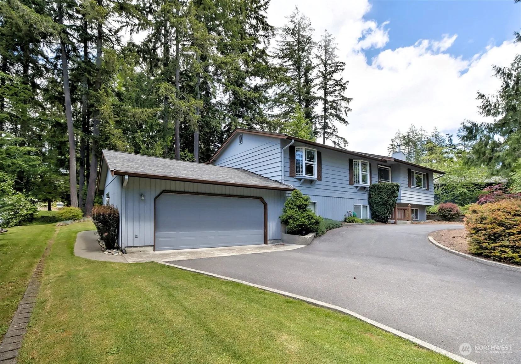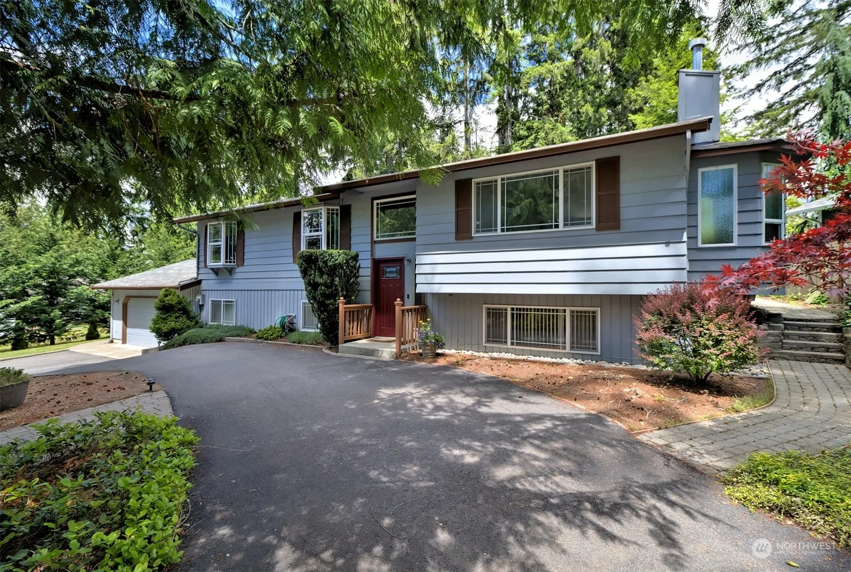 LAKELAND VILLAGE GOLF COMMUNITY. Come see this beautiful home! Spacious 3 bedroom/3 bath with more living space below. Nicely maintained property on the course has gorgeous natural, easy care landscape & circular driveway. Outdoor living spaces including a back patio/BBQ area & sunny deck. Great remodeled kitchen with large island, granite counters, & bay window eating space. Main level features open living/dining room with cozy propane stove, primary bedroom with attached bath, two more bedrooms & another full bath. Downstairs is a large sleeping or rec-room area with a sink, cabinets & countertops, & full bath. Large two car garage. LakeLand Community features private fishing/swimming lake, golf, pickle ball, walking, biking, & a Bistro!