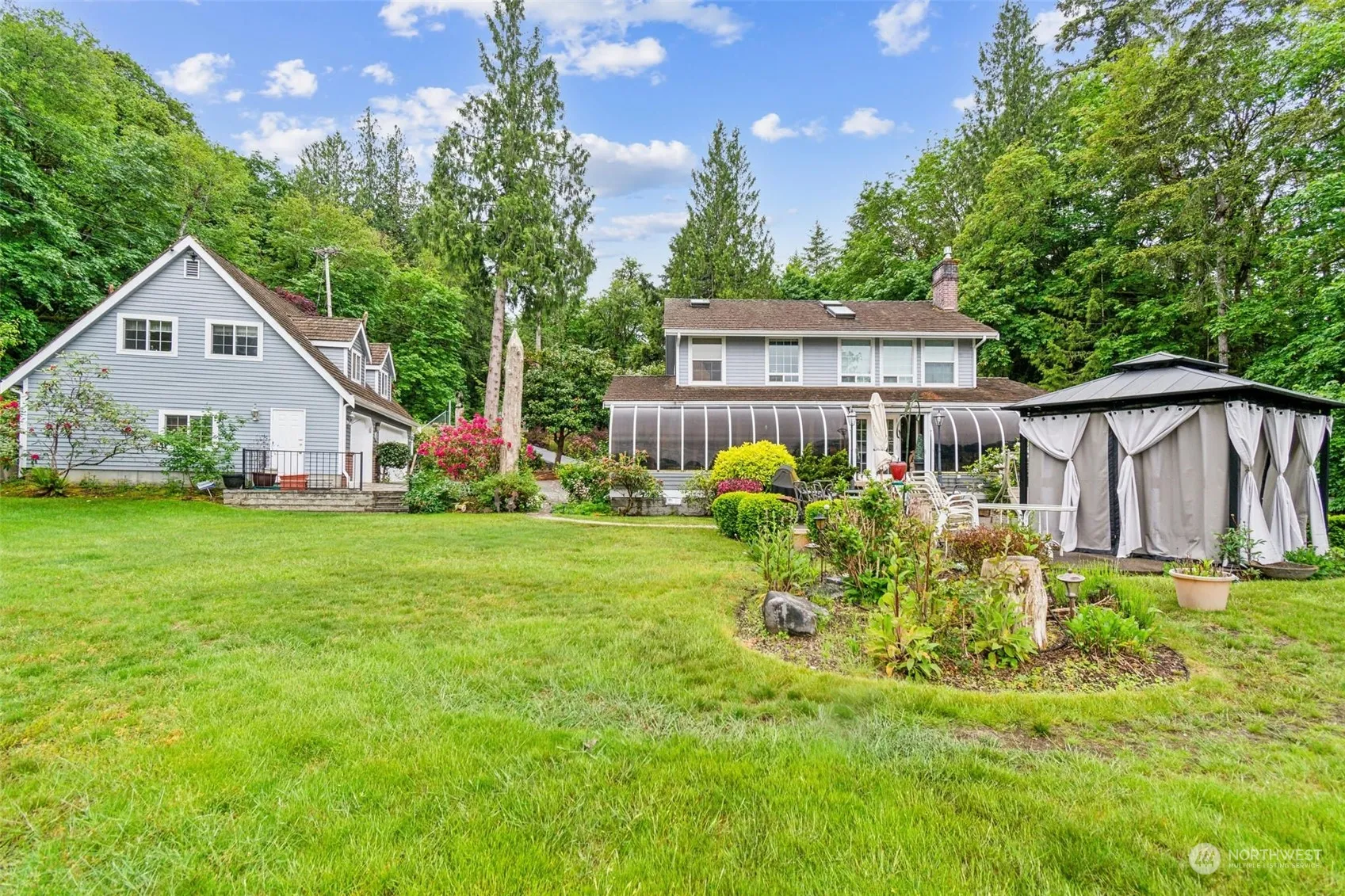 Rare opportunity to own a stately Case Inlet View home, with charming 768 sf ADU, bordering both Sherwood Creek and North Bay. Mature rhodies, lilacs, lilies surround the entry-a welcoming sight as you come down the driveway to the 2 acre property. Sparkling clean lrg kitchen w double oven, ample prep surface + floor-to-ceiling cabinets. Living rm with gleaming hardwoods is anchored by dramatic brick hearth with propane fp and is connected to the sun porch thru french doors. Primary is spacious w glorious views, vaulted ceiling, plenty of space for reading, or relaxing after a soak in the jetted tub. Pull down ladders under eaves at both ends for tons of convenient storage. Seller has invested $600k in improvements during their ownership!