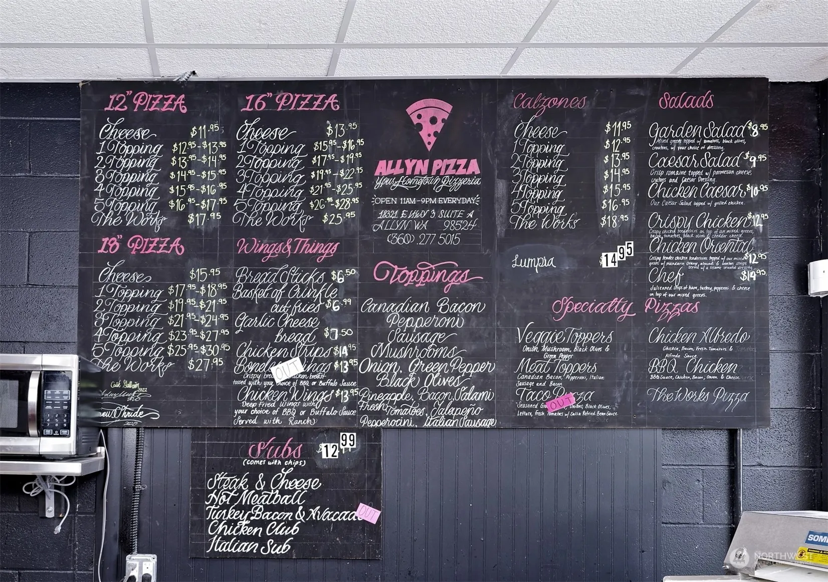 Turn key pizzeria and the only one in the heart of Allyn! Now’s your chance to grow the already thriving and profitable business with its well established customer base and sought after product. Top of the line equipment and a smooth-running system that is efficient in operation and service. Superb location in the Allyn center. Have you always wanted to start your own business but didn’t have the time/knowledge to build it from scratch? Now’s your chance to carry this business to the next level. The owner has streamlined the process and is offering you the chance with proprietary pizza recipes to excel and grow.