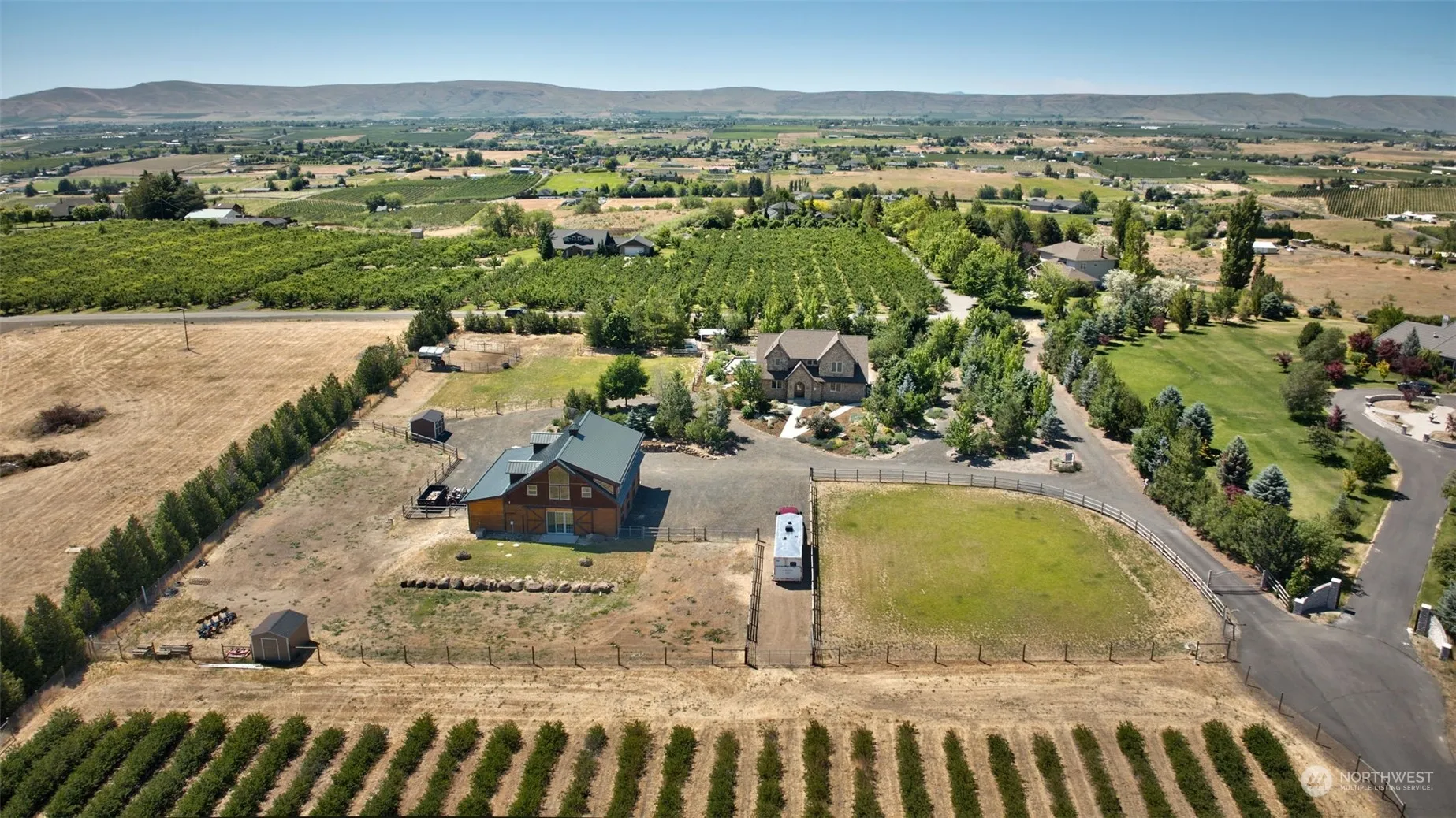 This opportunity features a stunning main house, a beautiful barn converted to finished event space + potential living/guest space, & room for animals or hobbies across 4.35 acres. The main house welcomes with stone exterior & thoughtful landscaping, wood floors, & high-end finishes. Upstairs, you’ll find 4 bed/2 bath. Step out back to find a saltwater pool & large patio. The true gem of this property lies in the converted barn. The lower level of this multi-functional space features a commercial sink/prep area, an industrial freezer, a 1/2 bath, a tasting room & add’l storage rms. The upper level of the barn is 1570 sq ft w/views & a great room, kitchen, 2 rms, & bathroom/laundry. Irrigated & fenced.