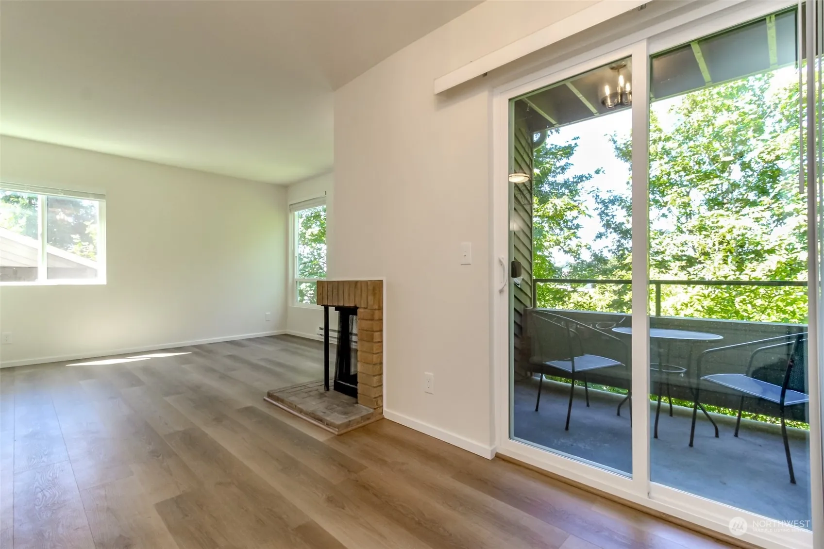 Everything is new, be the first to live in this newly updated condo. Enjoy modern features in this exceptional corner unit nestled amongst the trees. The home features new vinyl plank flooring, all new light fixtures, appliances, paint, cabinets .The kitchen boasts quartz counters, stainless appliances and beautiful soft close cabinets. Primary bedroom has a separate access to main bathroom with two sinks. The living area has plenty of light and a wood burning fireplace, Just off the dining room is your private deck. Washer- dryer hook up in dedicated closet. Carport for 1 car. Excellent location and walkability. Storage unit available as well as guest parking.
