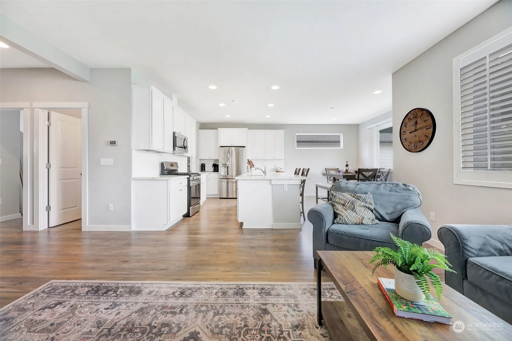 QUALITY construction w/AC on a level and dry shy 1/4 acre. This newer home has 5 bedrooms, 2.75 baths, plus a large loft area. Durable laminate hardwoods throughout the main with tile floors in the bathrooms and laundry. Guest bed on main (or home office!) + 3/4 bath. The SS kitchen has a 5 burner gas range, walk-in pantry, island seating for 4 with built in power, shaker cabinets, and beautiful slab quartz counters. Dining area has sliding glass doors to a large covered patio and huge fenced backyard. Playset stays! Upstairs is an open loft, laundry room, full bathroom, primary bedroom and 3 additional bedrooms. The king size Primary has a 5 piece bath with tile shower, soaking tub, double sinks, quartz counters, and huge walk-in closet!