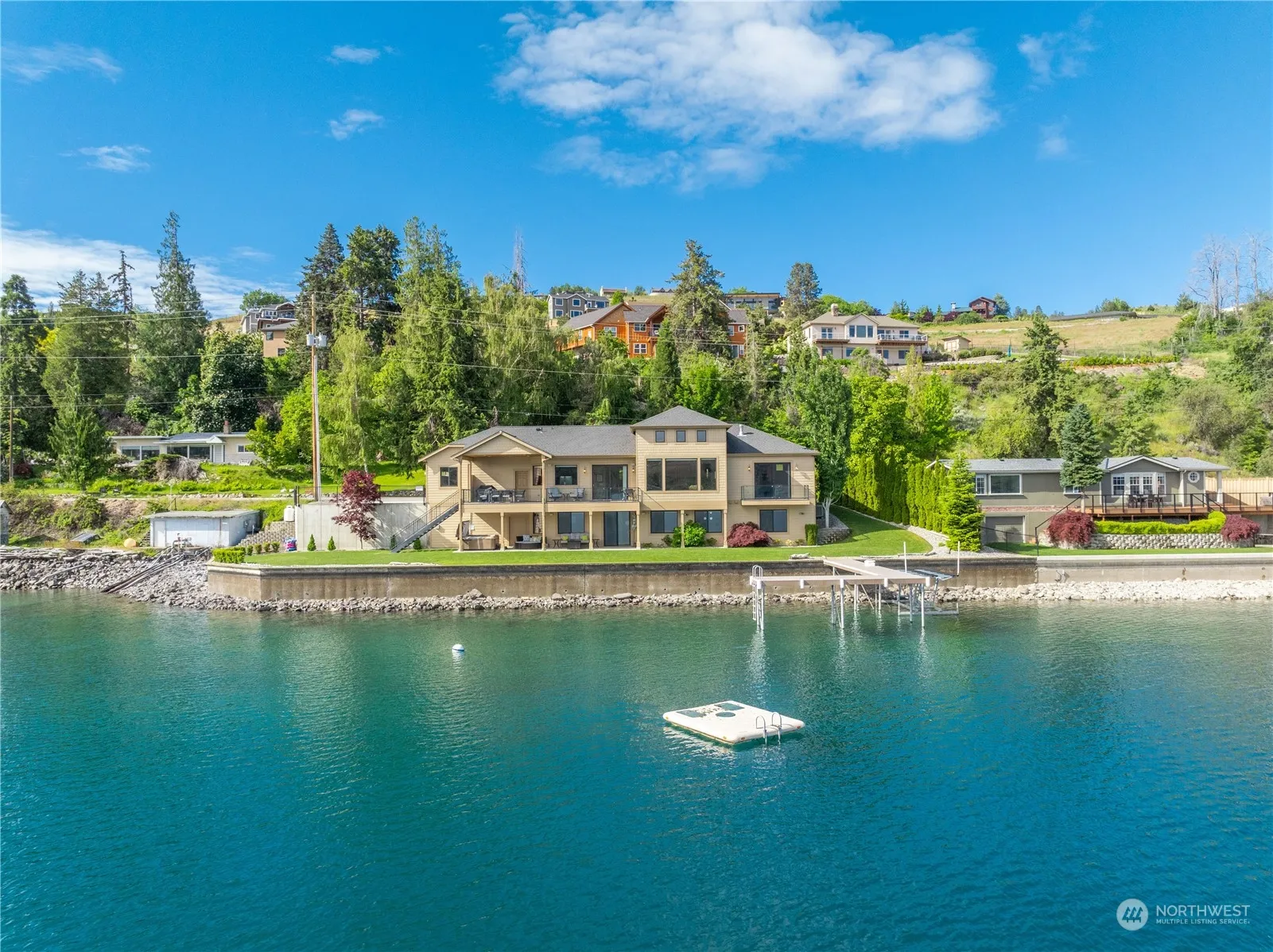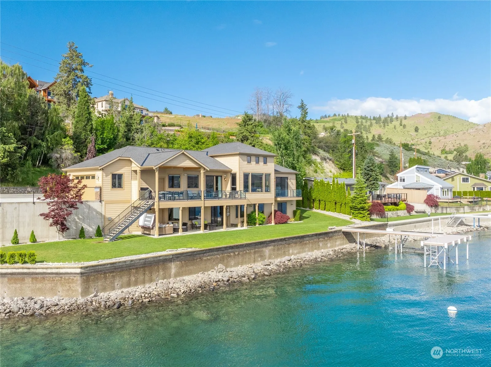 Welcome to 1300 S Lakeshore Rd! Pristine, waterfront home nestled within the Golden Mile on Lake Chelan – the premier location along the south shore! This +4,000 sqft luxury craftsman style home is the epitome of paradise, featuring +140ft of low-bank bulkhead waterfront, private dock, swim platform, boat buoy, & 7,000lb Basta boat lift. Home offers high end finishes with 5 beds, 3.25 baths, soaring ceilings, chef’s kitchen w/ al fresco dining, covered deck with legendary lake views, and luxurious primary bed w/private balcony on main. Host your guests downstairs with 4 beds, family room and access to water’s edge – equipped with easy maintenance landscaping & hot tub. Near wineries and downtown Chelan. Let’s make memories at the lake!