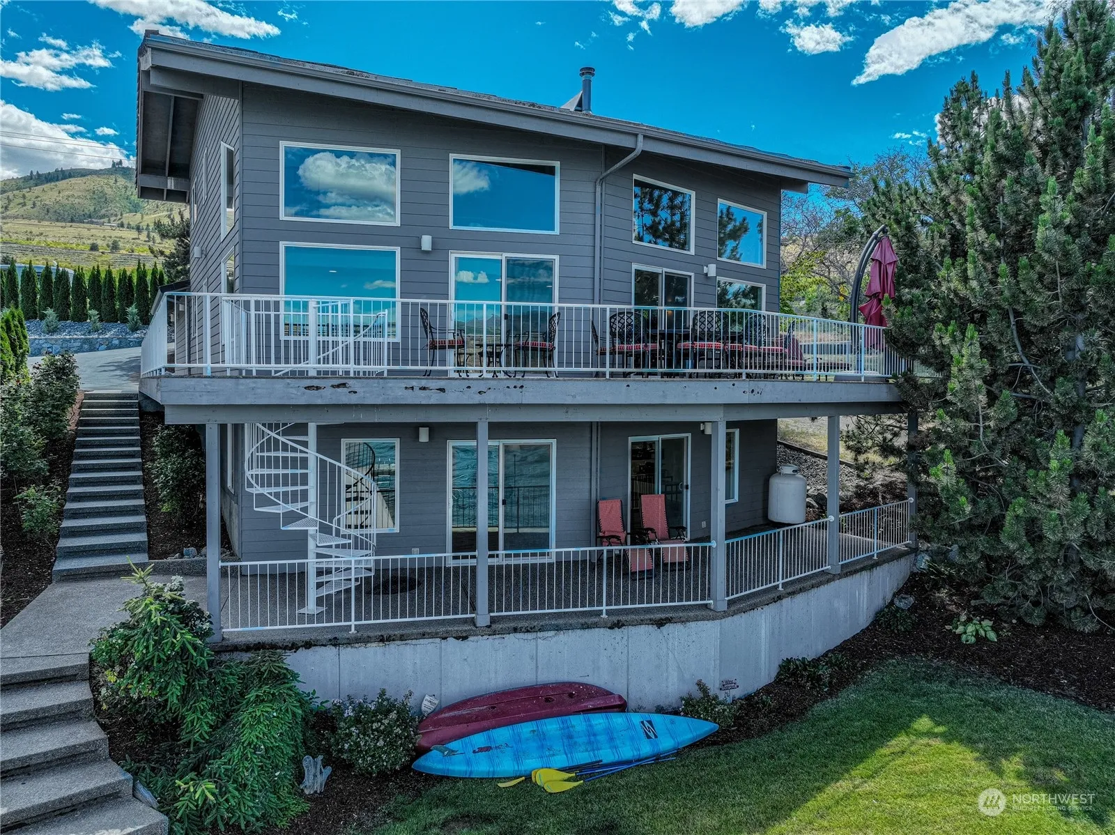 Make this Lake Chelan waterfront retreat your own! Just 5 minutes from downtown Chelan on the coveted South Shore, this large NW Contemporary home features a light-filled great room with vaulted ceilings. Three bedrooms, bathrooms on each level, and finished basement offer generous space for hosting friends or creating your private lakeside estate. Panoramic views of Lake Chelan from all three levels, plus a large deck, lakeside lawn, bulkhead, buoy, and updated dock with boat lift. The oversized garage provides space for your vehicles and storage or game area. Imagine relaxing mornings by the water, fun-filled sunny days, and peaceful evenings under the stars. Downtown Chelan, wineries, and restaurants are just minutes away.