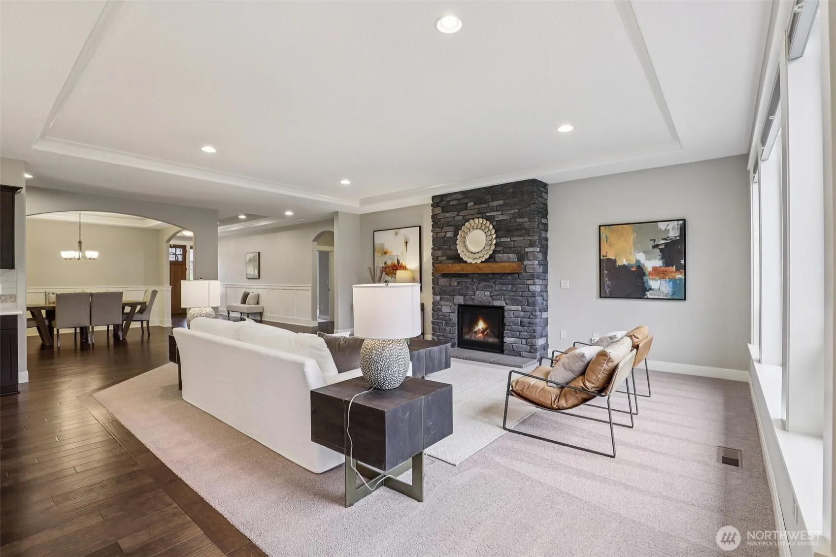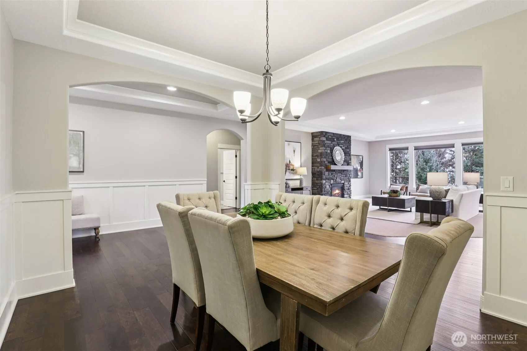 This beautifully appointed home welcomes you with a tranquil water feature and covered front porch. An 8-foot 9-lite door with sidelites and keyless entry opens to an elegant interior featuring board and batten wainscoting, engineered hardwood floors, tray ceiling, and crown molding. The formal dining room, framed by arched entryways, continues the refined millwork and flooring. The great room showcases a gas fireplace with floor-to-ceiling stone surround and large windows overlooking the covered deck and backyard. The gourmet island, breakfast bar kitchen offers stainless appliances, soft-close cabinetry some with glass panes, quartz countertops, subway tile backsplash with glass tile accents, and dining area with slider access to the deck. The primary en-suite features a tray ceiling, walk-in closet, deck access, and a spa-like bath with dual quartz vanity, soaking tub, ceiling-height tiled shower, private water closet, skylight, and tile flooring. Two additional bedrooms, den or office with French doors, bonus room, and laundry/mud room provide flexible space. Designed with a split-bedroom layout, high ceilings, and detailed millwork, this home blends comfort and style. Enjoy a covered Trex deck with steel cable railing, landscaped yard with sprinkler system, four apple trees, 3-car garage, RV parking, and tree-lined privacy with territorial views to Oregon. Mortgage savings may be available for qualified buyers.