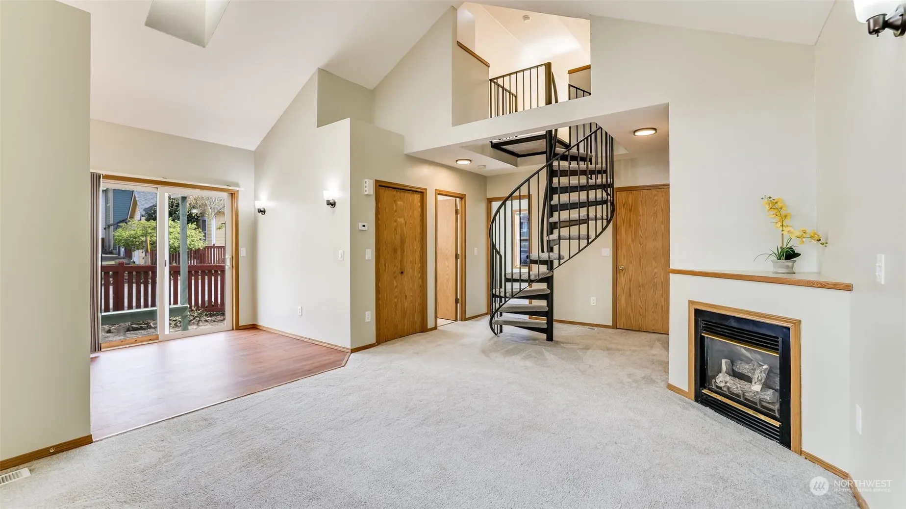 Welcome to your charming detached townhome in quaint Black Diamond! Vaulted ceiling in living room makes the space feel spacious, airy and bright while the gas fireplace adds ambience for cozy evenings. Lives like a 2 bedroom. Main floor boasts a refreshed bathroom next to the primary bedroom. Head up the spiral staircase to the loft den/office – perfect for working from home, guest space, exercise, or hobbies! Park with ease in the attached one-car garage or use additional parking spot just steps away. New kitchen floor, new water heater, new lighting, newer roof. Enjoy quiet mornings on the covered front porch & the fenced yard. Experience relaxed living in this well-maintained home near the library & Ten Trails.