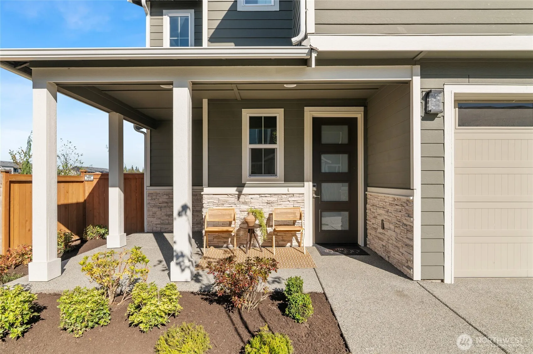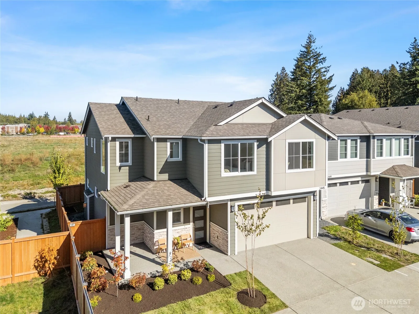 Nearly new 2023-built 4-bedroom, 2.5-bath home blends modern design, quality craftsmanship, and comfort. The open floor plan features a bright great room with large windows, luxury plank flooring, and a gas fireplace. The kitchen shines with quartz counters, stainless appliances, and a large island perfect for gatherings. Upstairs offers four spacious bedrooms including a primary suite with walk-in closet and spa-inspired bath. Enjoy year-round entertaining under the covered patio overlooking the fenced backyard. Energy-efficient systems, 2-car garage, and convenient upstairs laundry. Close to top-rated schools, parks, shopping, and commuter routes.