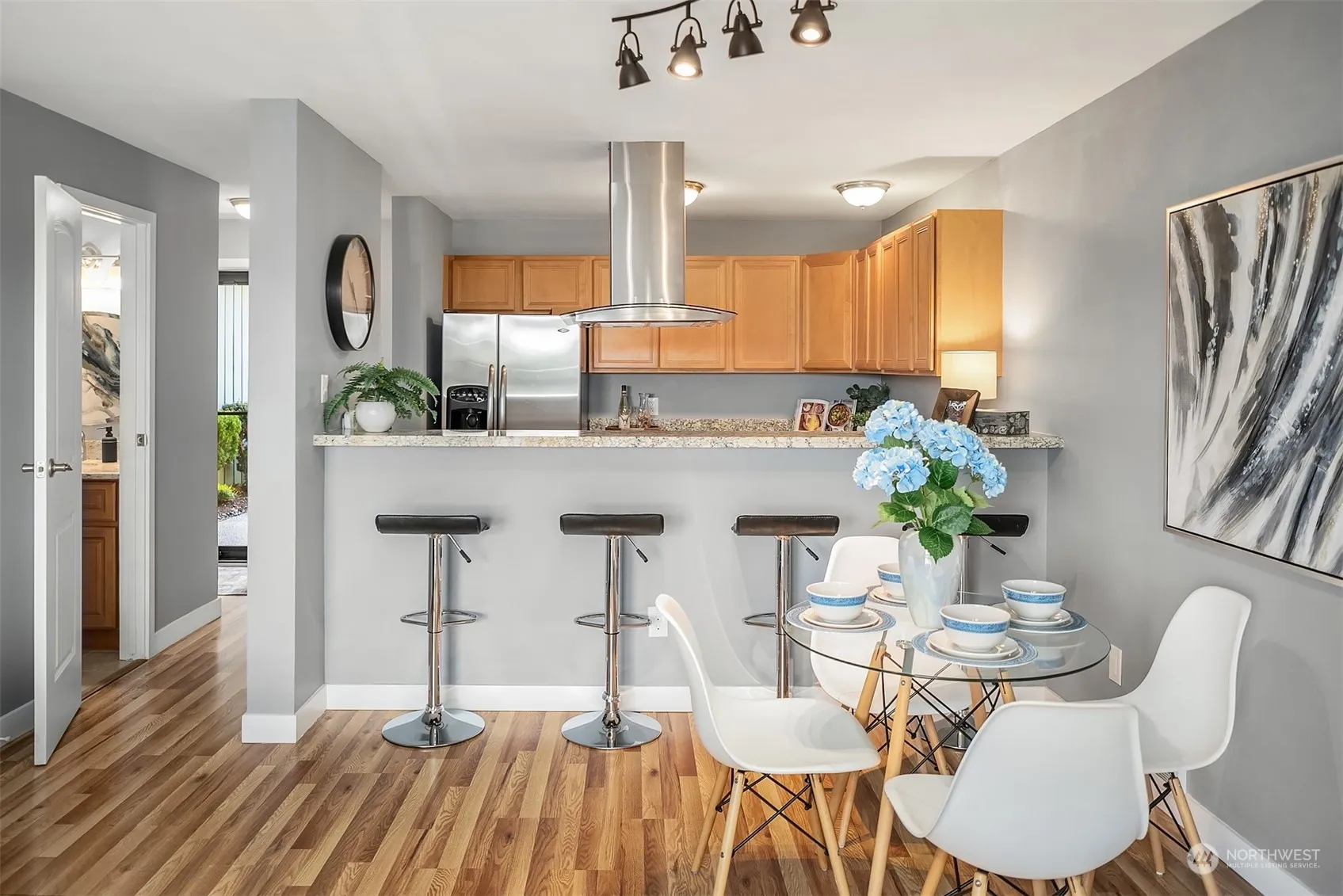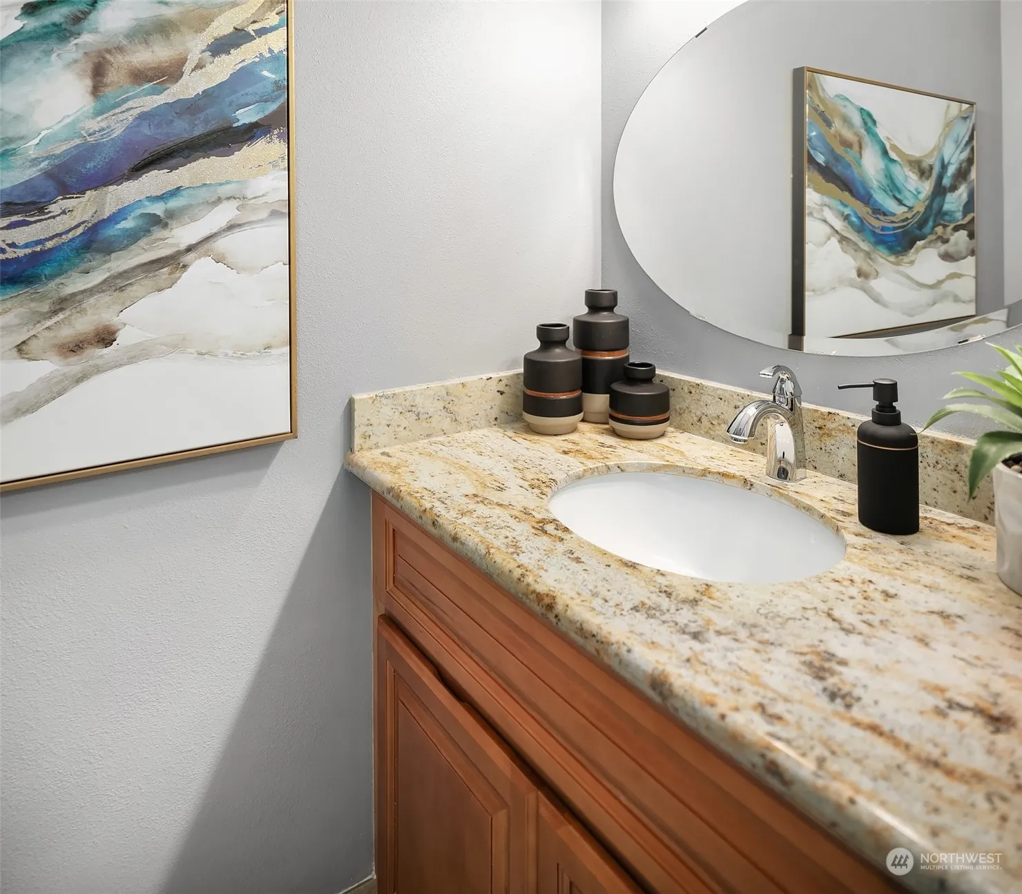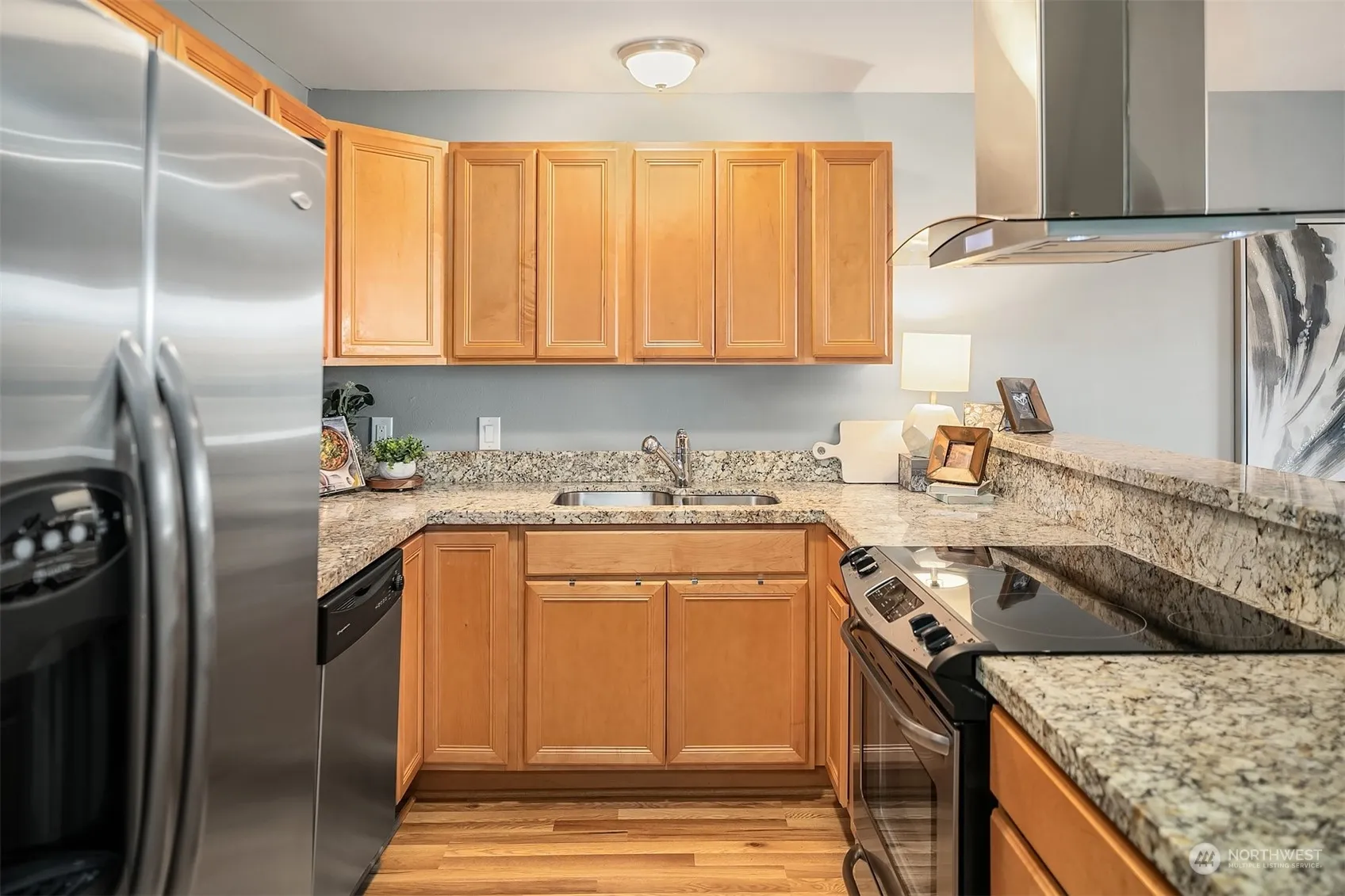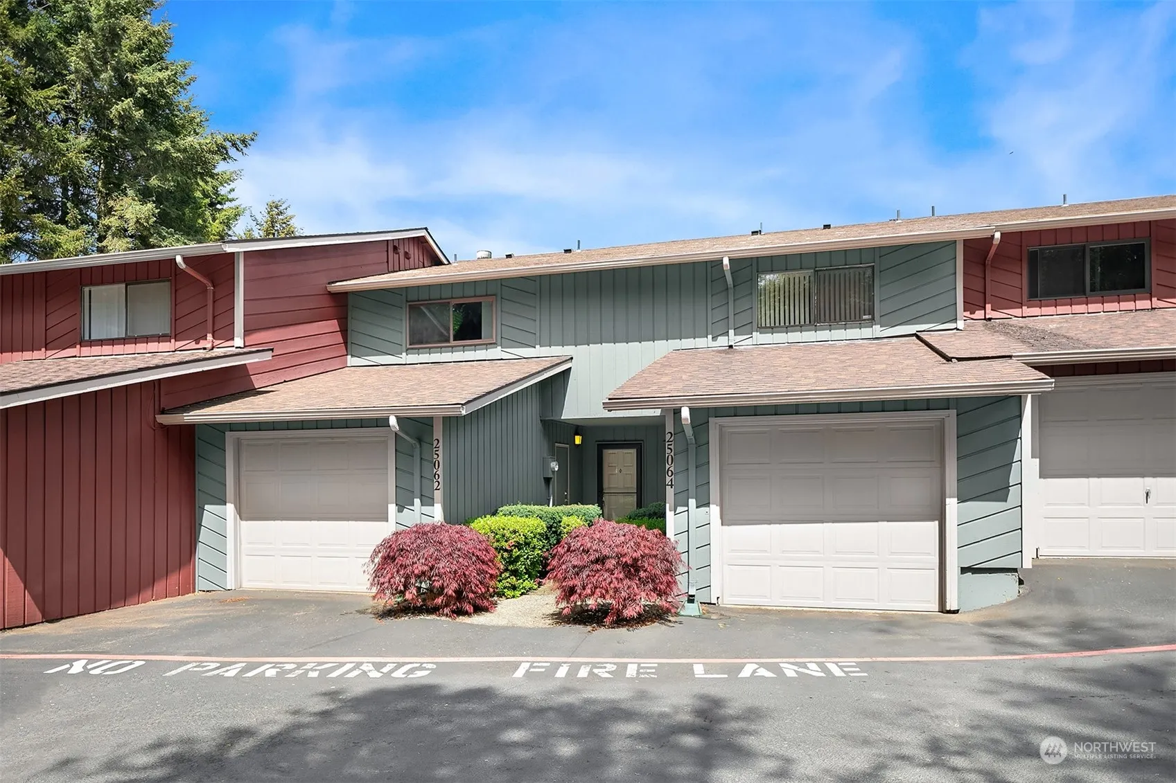 Welcome! Light and bright 2 story Condo with a View that goes for miles! Enjoy the updated Kitchen, complete with granite countertops, stainless appliances, a large double sink, breakfast bar, and tons of cabinetry for storage. Beautiful wood floors on the main floor, and a half Bath for guests. Stylish wood fireplace for those cozy winter nights. 2 Bedrooms upstairs connected by a full Bath, recently remodeled. Newer windows and sliding glass door. One car garage with storage space. Beautiful Lake Fenwick just down the road, with trails, playground, and Disc golf – bring your paddle board or fishing pole! Riverbend Golf Course within view of your private deck! Minutes to I-5 or 167 makes for an easy commute. Welcome home!