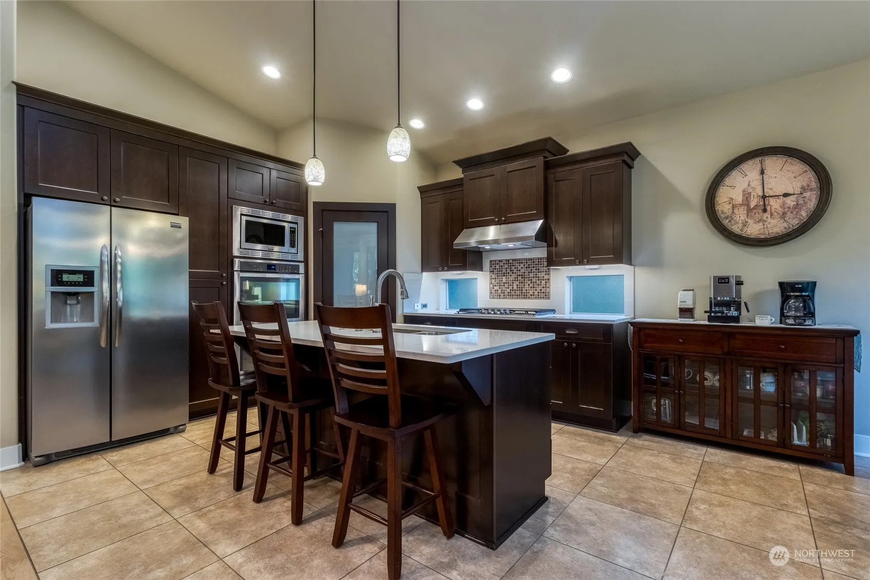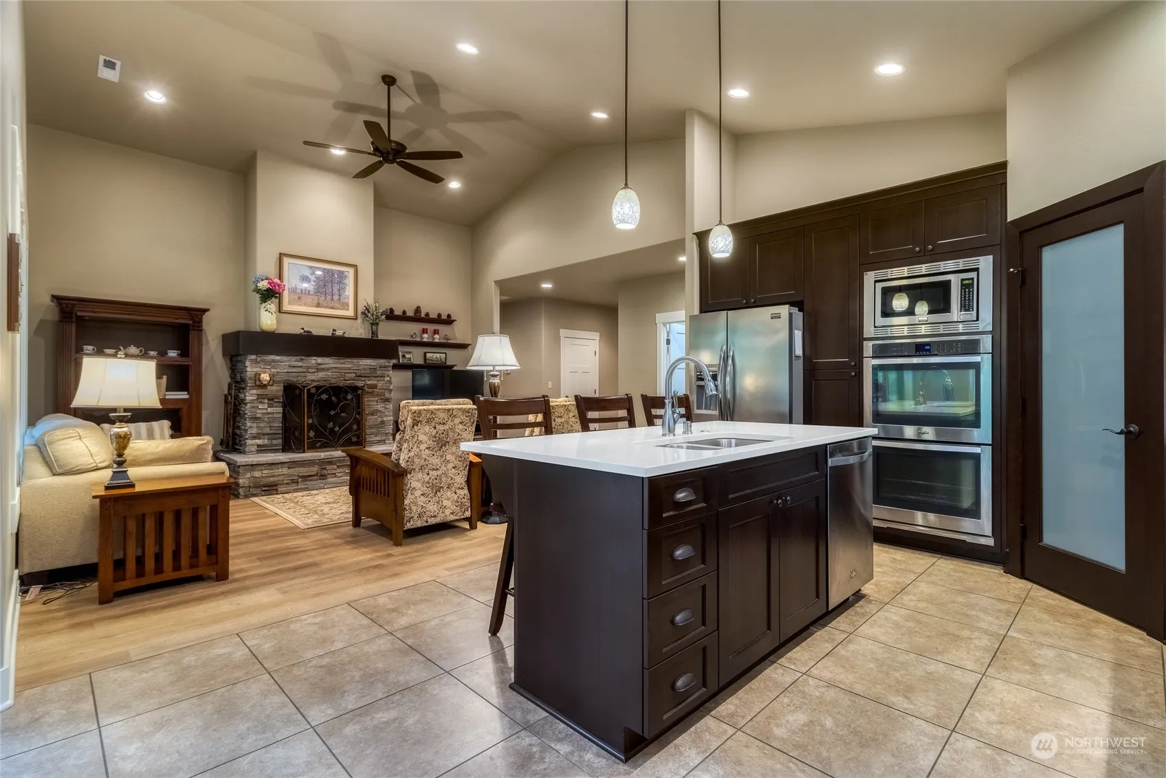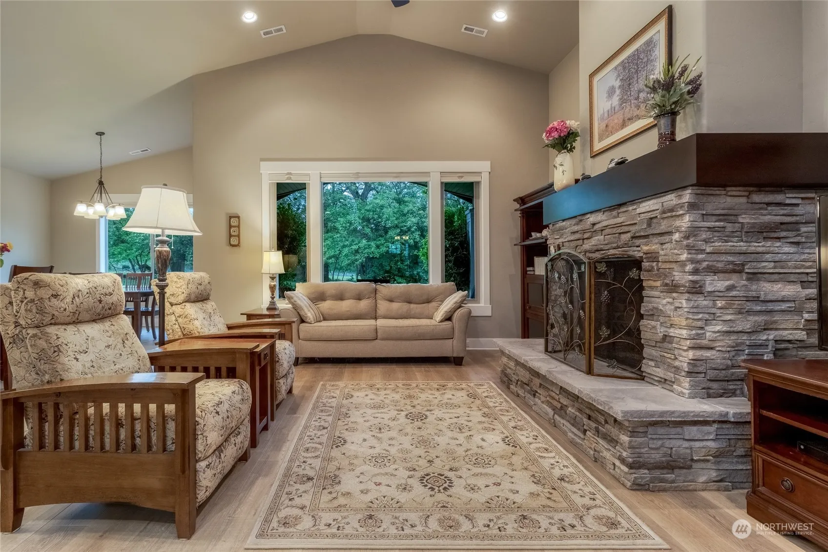 Stunning single level home with picturesque backyard and patio overlooking serene creek and lush trees, enjoy the soothing sounds of nature from your bedroom window. Open floor plan, vaulted ceilings, beautiful primary bedroom with ensuite and a spacious closet. The kitchen is adorned with quartz countertops, soft-close cabinetry. Beautiful mill work throughout, real wood fireplace in the great room (can be converted to gas), adding charm and elegance to this inviting space. Luxury vinyl plank flooring in the great room, entry, and bedrooms, tile in bathrooms, kitchen and dining room. Mature landscaping, with something new to enjoy every season. Garage is practically a three car garage with the six foot bump-out, perfect for extra storage.