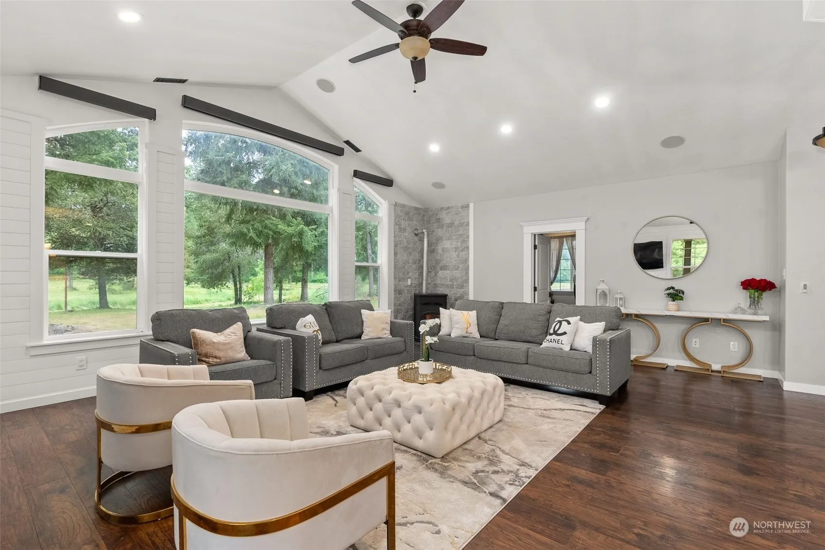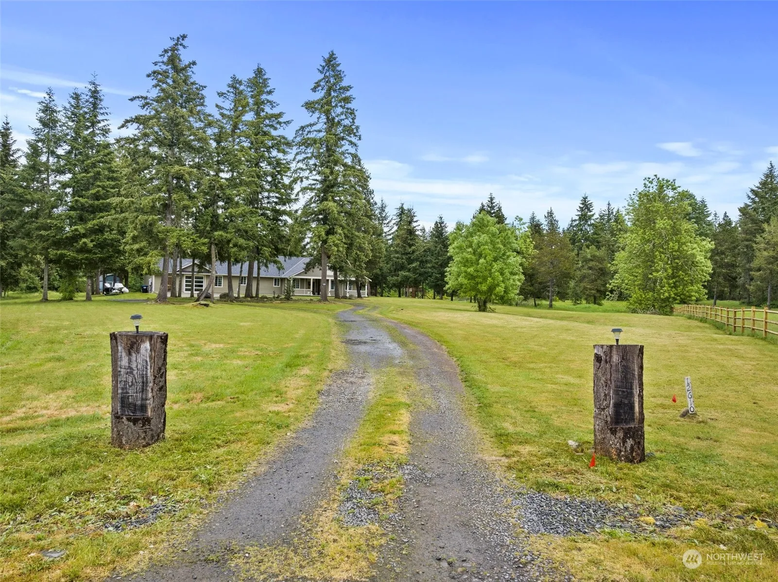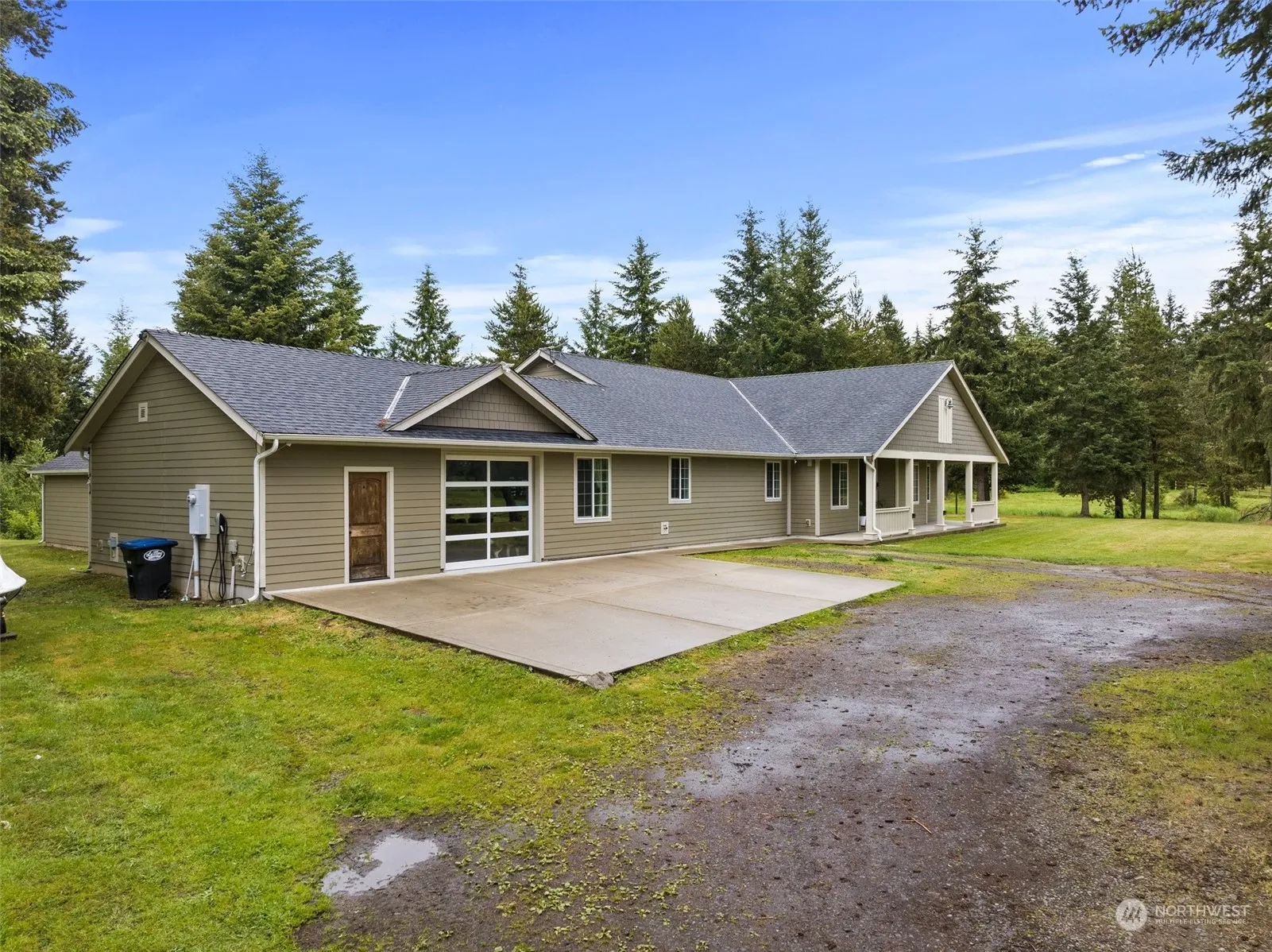 Exquisite 3bed + bonus room, 2-bath rambler located on over 10+ acres. The open floor plan ft living room w/ vaulted ceiling, ceiling fans, pellet stove, stunning cathedral windows w/electric blinds. The gourmet kitchen boasts ample cabinetry, an island, & industrial fridge. The primary bedroom is complemented by an updated, spa-like bathroom that now includes a high-end soaking tub, dual vanities, and premium fixtures for the ultimate relaxation experience. The bonus room is perfect for entertaining, complete w/a full wet bar & a door leading to the salt-water hot tub. This smart home is equipped w/USB plug-ins throughout, two outbuildings, RV hookup, & a Tesla fast-charging station for electric vehicles. Quick commute to JBLM.