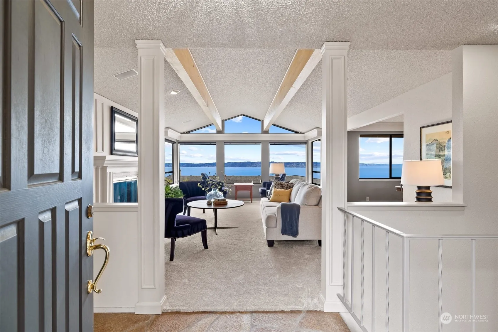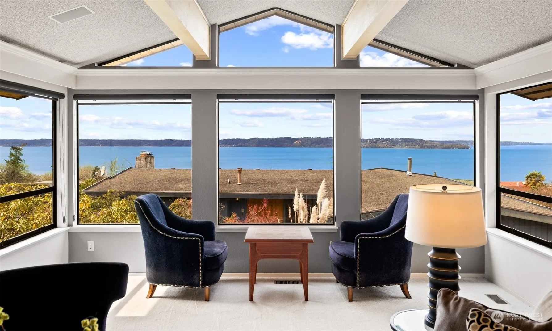 Embrace sweeping Sound & Olympic Mt views from this incredible home in desirable Marine Hills neighborhood. Perfectly sited on large lot w/plenty of room for all ages to play & garden to your heart’s delight. Step inside onto beautiful stone flooring, then prepare to be mesmerized by soaring beamed ceiling & wall of windows in the living rm. Bathed in natural light, this room comes with a gorgeous fpl and adjoining formal dining. Inviting kitchen offers gas range, garden window, natural stone countertops & breakfast nook with slider leading to an entertainment sized deck+hot tub. Lovely main floor primary suite enjoys that view, together w/3 closets & ensuite 3/4 bath. Lower level rec rm, office area & workshop. 5 yr roof, sprinkler system.
