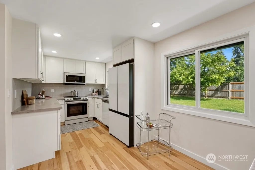 Introducing a charming remodeled Mountlake Terrace gem! This low-maintenance Rambler boasts 3 bedrooms and 1 bath, offering ample natural light throughout. Enjoy a cozy eat-in kitchen with generous storage space throughout. The spacious primary bedroom features a delightful sitting area. Step outside to a large fully-fenced lot, complete with an entertainment-sized deck and handy storage shed. Parking is a breeze with plenty of space in the driveway and street. Conveniently located near schools, Starbucks, grocery stores, a gym, and an array of restaurants. Plus, easy access to I-5 and I-405, shopping centers, parks, bus stops, and the new light rail station just minutes away. Your perfect home awaits in this sought-after neighborhood!