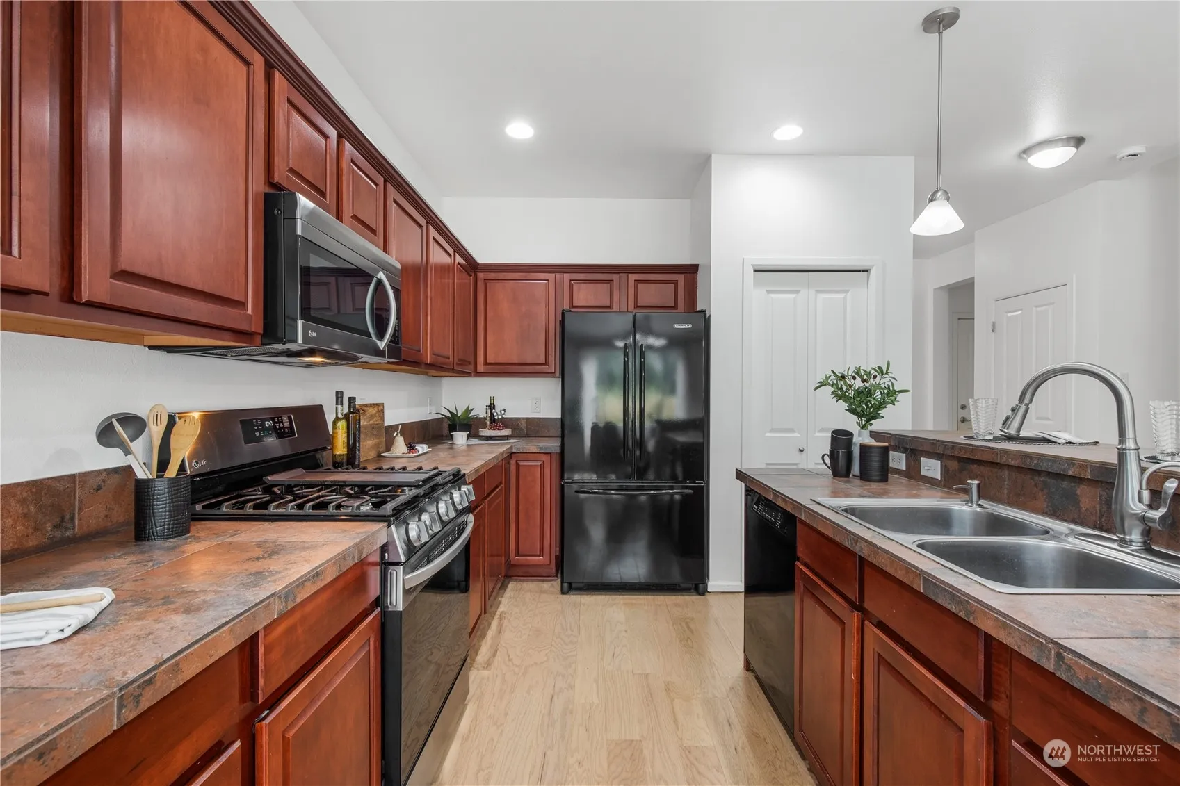 Welcome to the Radiance Community, featuring running trails, basketball court, playgrounds, baseball field and skate park. 4 bedroom plus bonus room on corner lot. Inside you will enjoy updated luxury plank flooring on the main level, open concept design, spacious living room and freshly painted walls. One Bedroom on the main. Fully fenced yard that back up to green belt with patio and walkway with BBQ. Garage floor is painted and equipped with extra storage room. Updates include water heater, fence, heat pump, Washer/Dryer, Stove, microwave, roof, and furnace, all within the last 3 years.