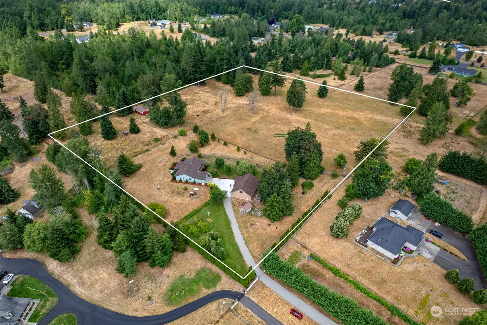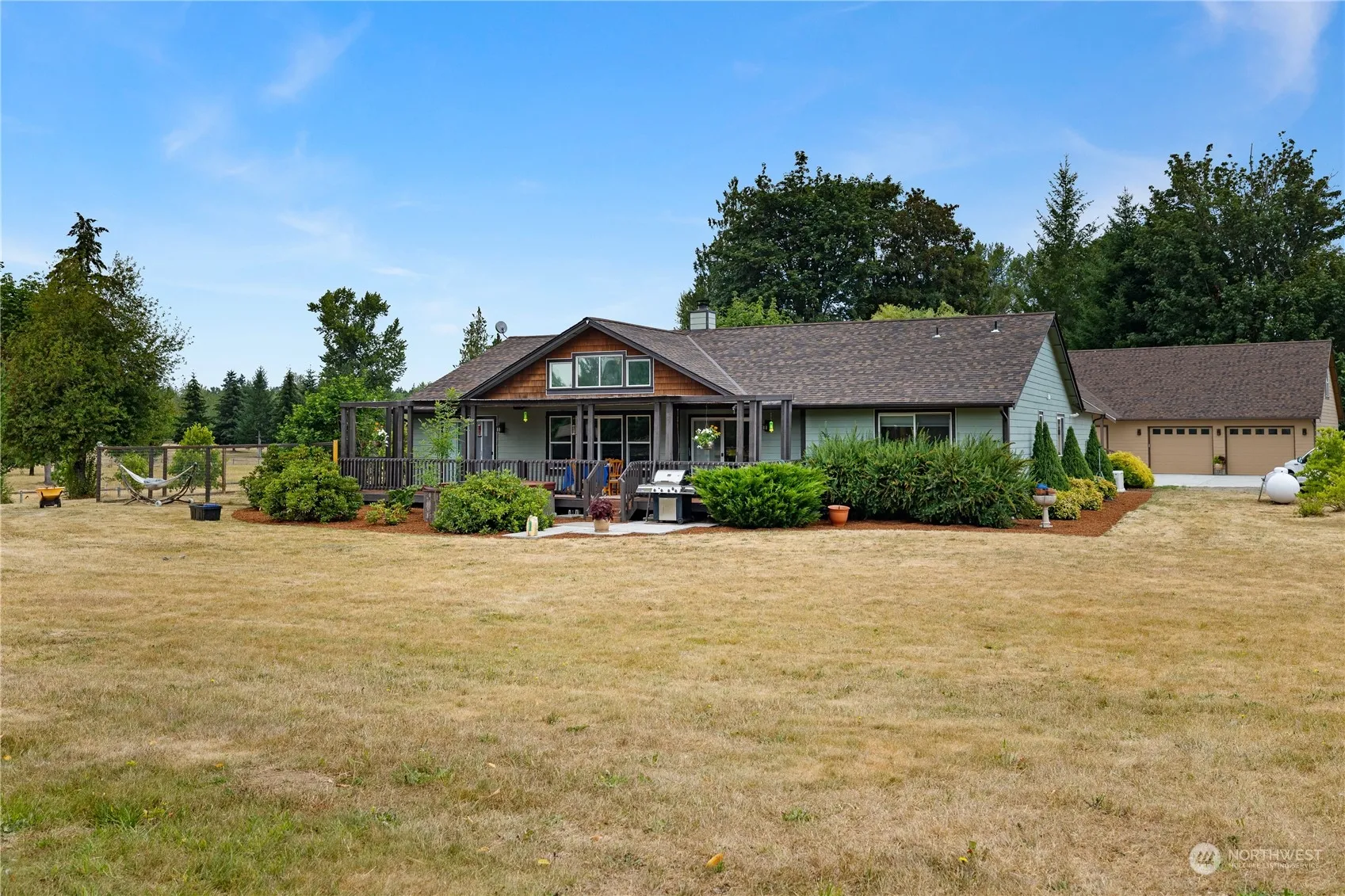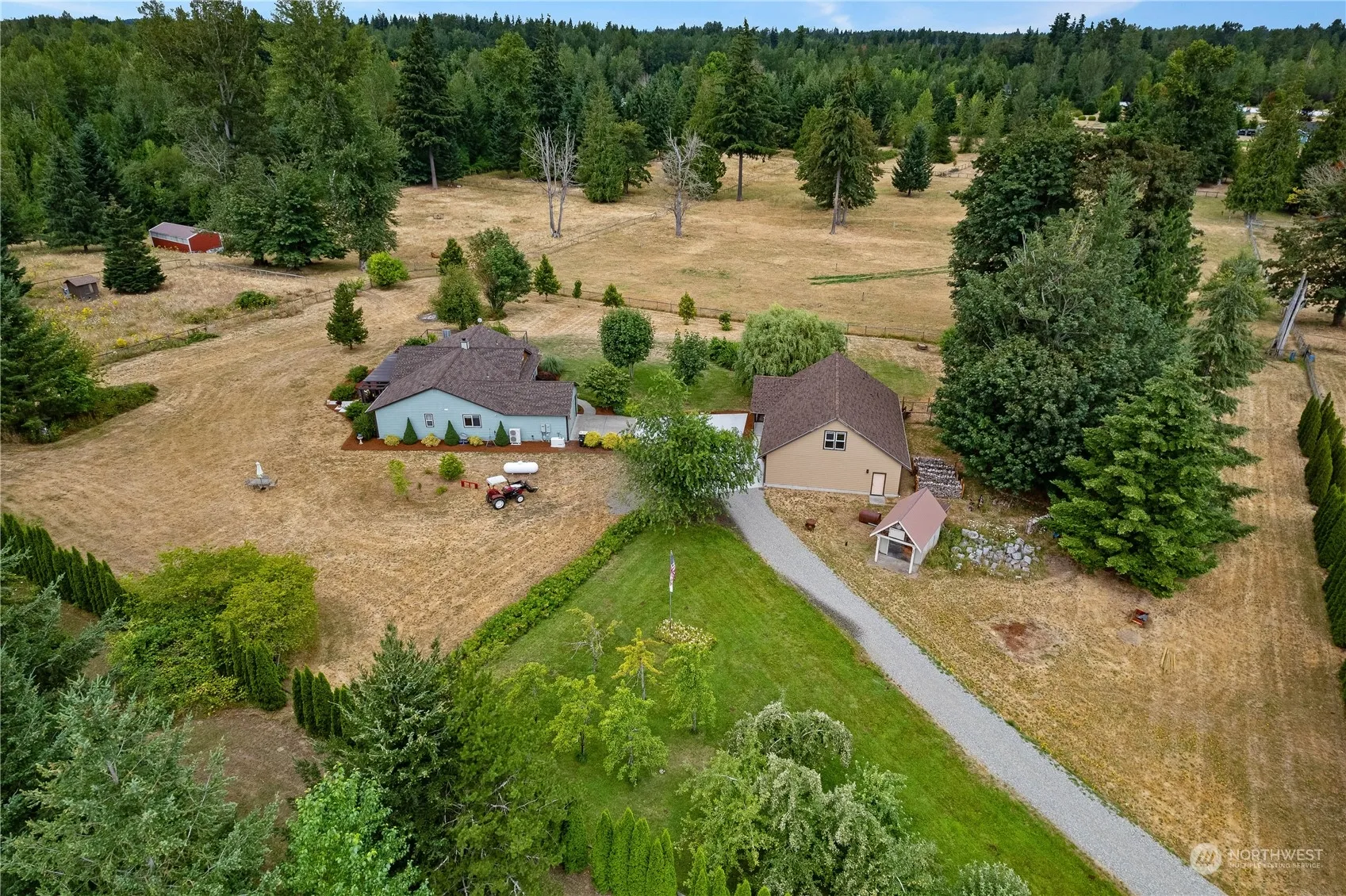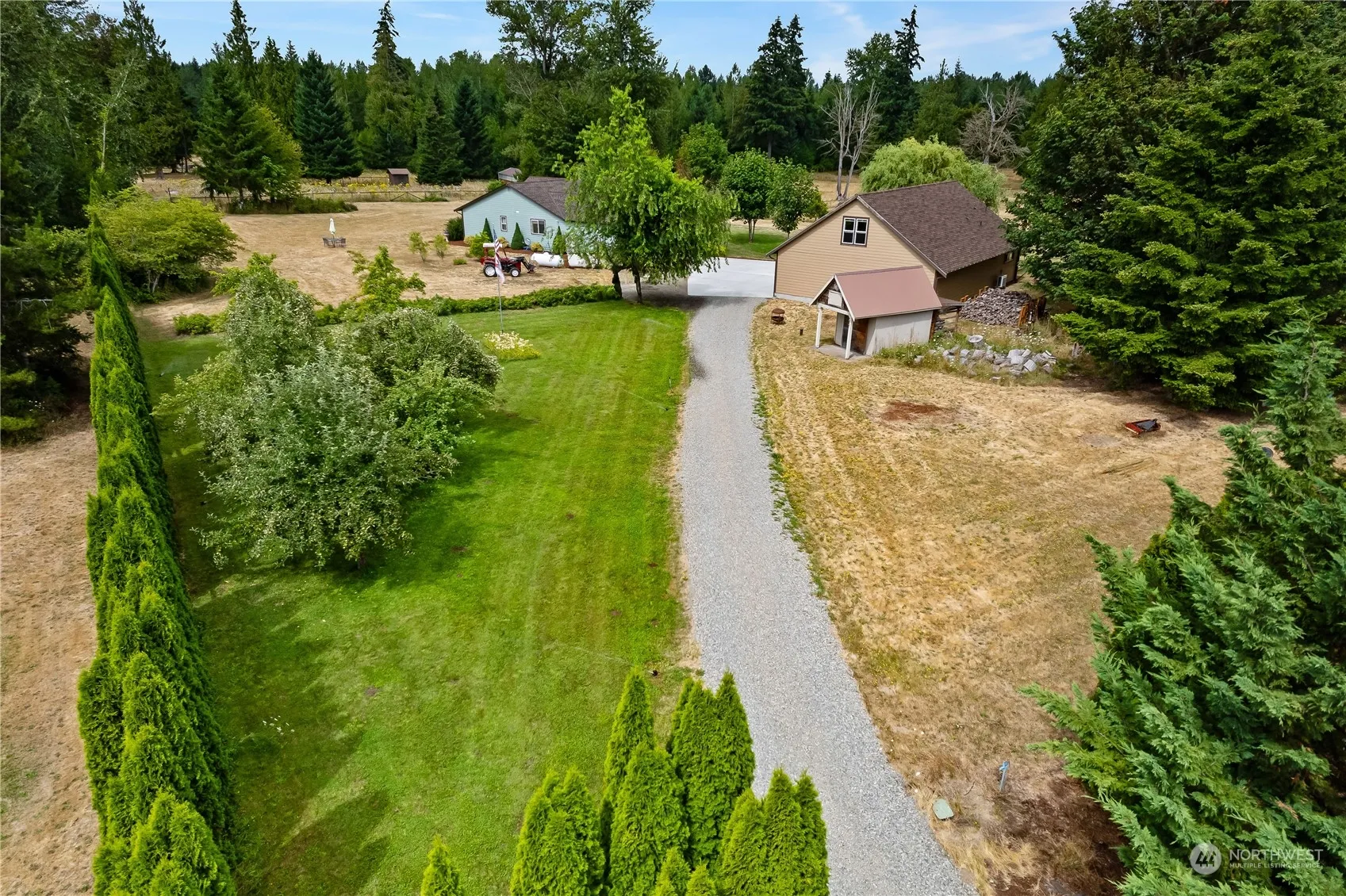 TWO HOUSES!! 3019 Sq Ft on Secluded 12.84 Acres usable No Wetlands. Main House Just Painted 2203 Sq Ft, 3 bed, 2.5 bath. Second House: 816 Sq Ft (generational living or Rental) 1 bed, 1 bath. Beautiful Granite Countertops, White Cabinetry, Stainless Appliances in both. Main House: Central Vacuum System, Extraordinaire Fireplace, New Primary Bath, New Heat Pump in 2021, New Generator 2020 w/500-Gal Propane Tank, New Roof 2023 Stereo System w/speakers in all main areas. Built-in Cabinet in Office/Den. Second House: Attached 4 car tandem garage, 735 Sq Ft insulated but unfinished second floor, could be Rental/Game Room/Office/Art Studio. Fully Fenced w/Irrigation, 20×40 Storage & 3 Outbuildings, & Sunken Greenhouse w/Water, Fruit Trees & More!