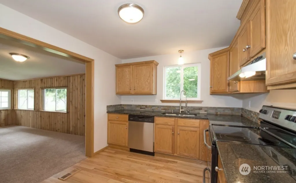 3 bed 2 full bath 1,550 sq ft Rambler close to downtown Yelm on a shy 1/3 acre. Master suite w/walk in closet & full bath. Hardwood floors in the living area. Kitchen features granite counters, tile backsplash, stainless appliances & a large area for dining. 90% efficient gas furnace. Wood fireplace. Great view of Mt Rainier from your living room window & front yard. Out building & Fruit trees in the rear yard. Detached 2 car garage & extra room for a shop.