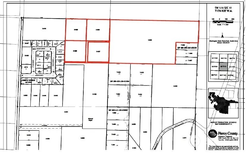 This is 6 parcels of land totaling 27.6 acres, road access unavailable, would best be used as a large single home sight or potentially a couple of homes/DADU setup, designated forest land per RCW 84.33 and zoned R10, developing land would require paying property tax difference for the past 8 years per Pierce County, buyer to do their own due diligence, largest parcel is 17.5 acres and this parcel could be used for home sight with restrictions, street access is off 64th Ave S that is accessed off 312th St S by way of Hinkleman Rd S, utilities are not on the property, buyer will need to verify any needed information to their own satisfaction. Pierce County Parcel numbers: 0217113042, 0217113026, 0217113027, 0217113029, 0217113030, 0217113700