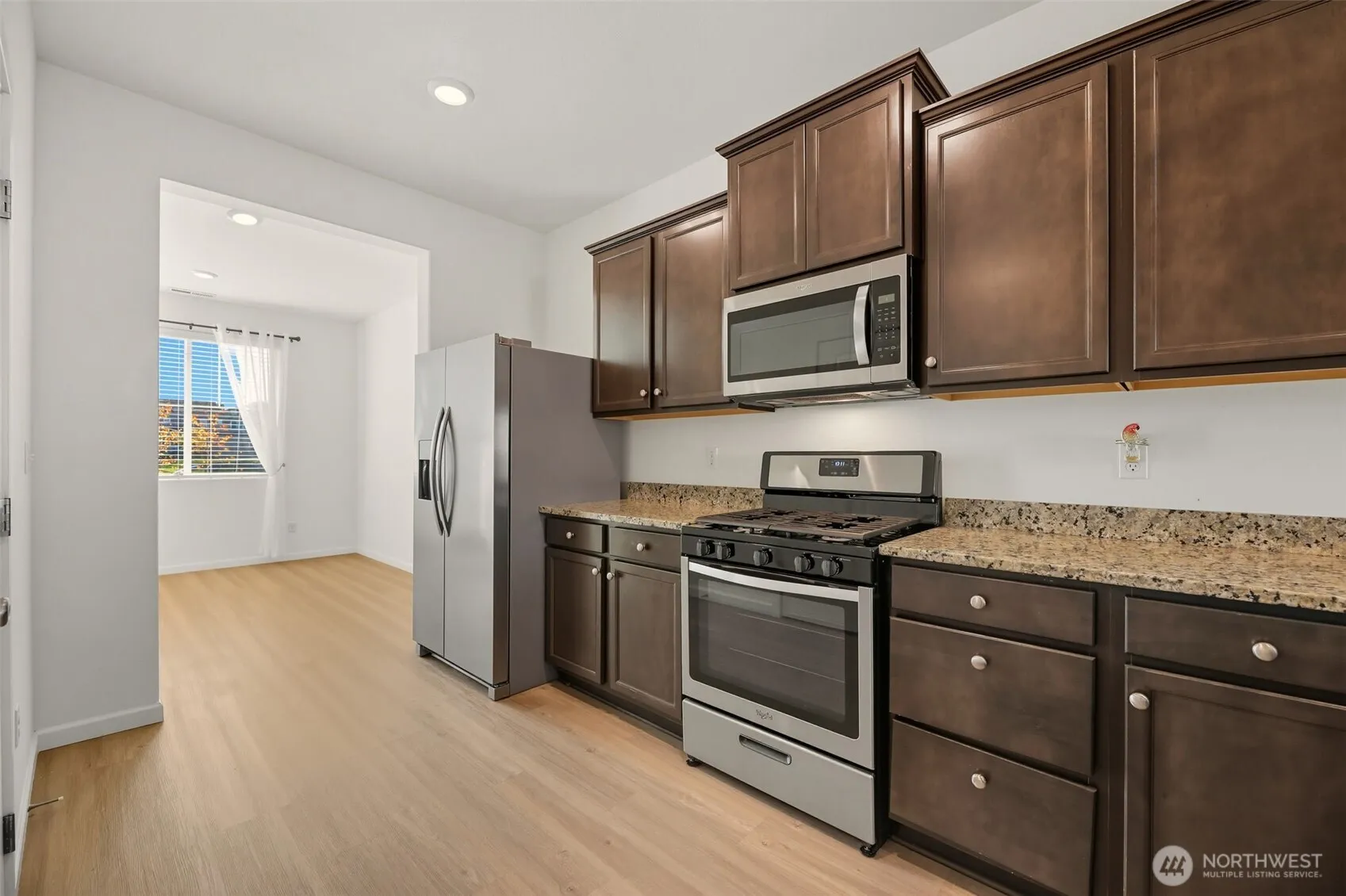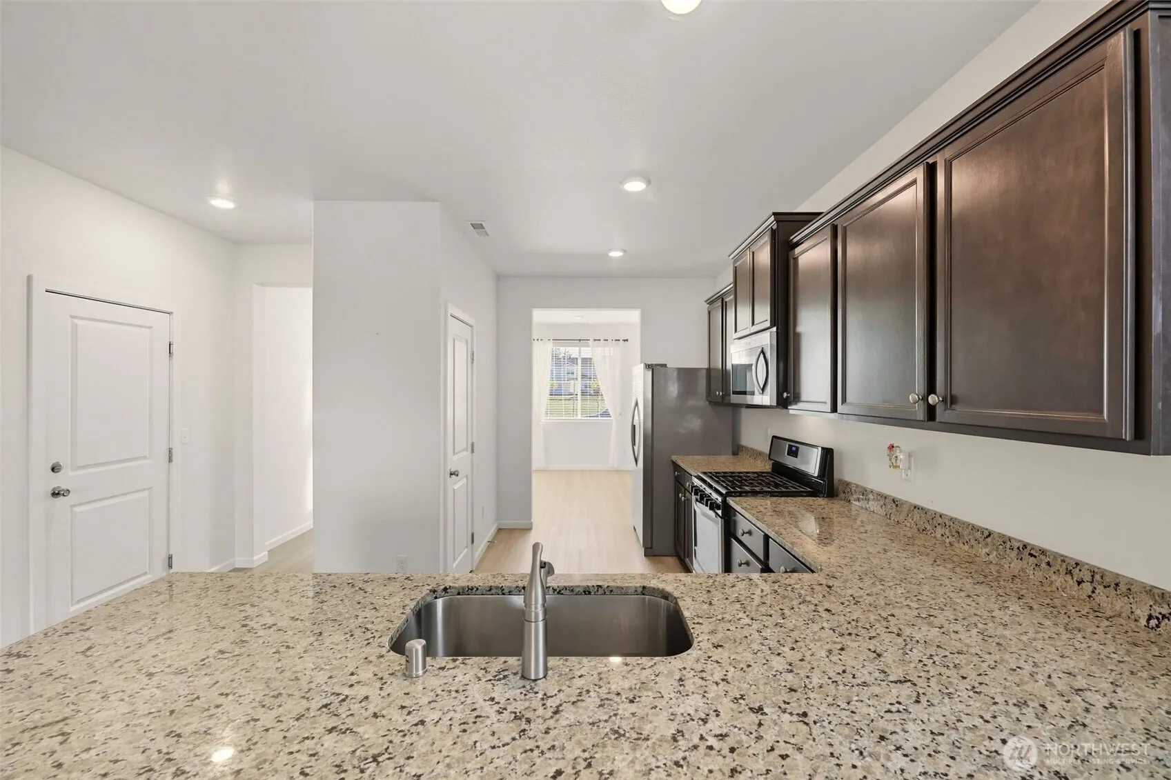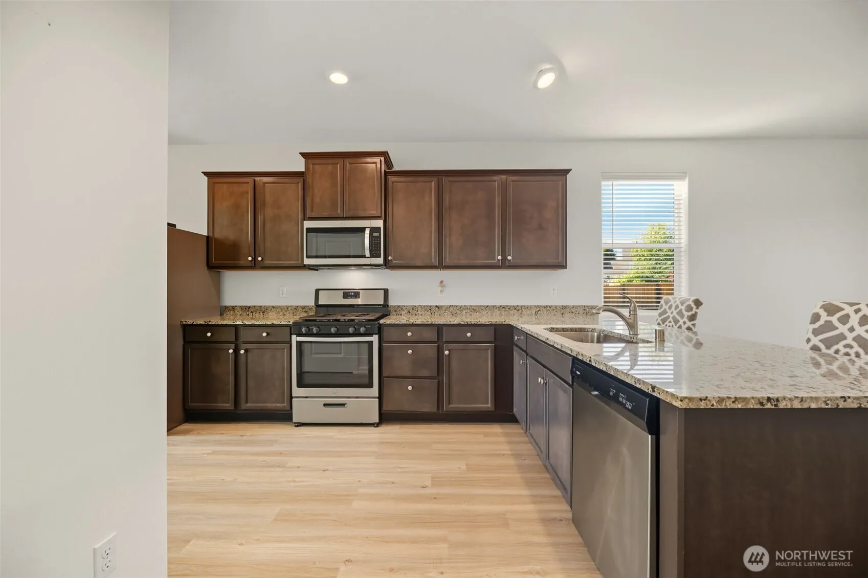 Like new rambler in the highly desirable Cedar Hills Estates! This single-level home offers a modern design and an open-concept. It lives large and light due to the 9ft ceilings and oversized thresholds.The kitchen shines with stylish granite countertops, stainless steel appliances, and a spacious pantry. A versatile front flex room is perfect for a home office, exercise space, or formal dining/living room—your choice! The light-filled primary bedroom features a lovely ensuite bath for added comfort. Step outside to enjoy the beautifully landscaped yard with a stunning deck plus fully fenced. Situated just across the street from a large park and play area. This home is close to shopping, restaurants, entertainment and ready for you!