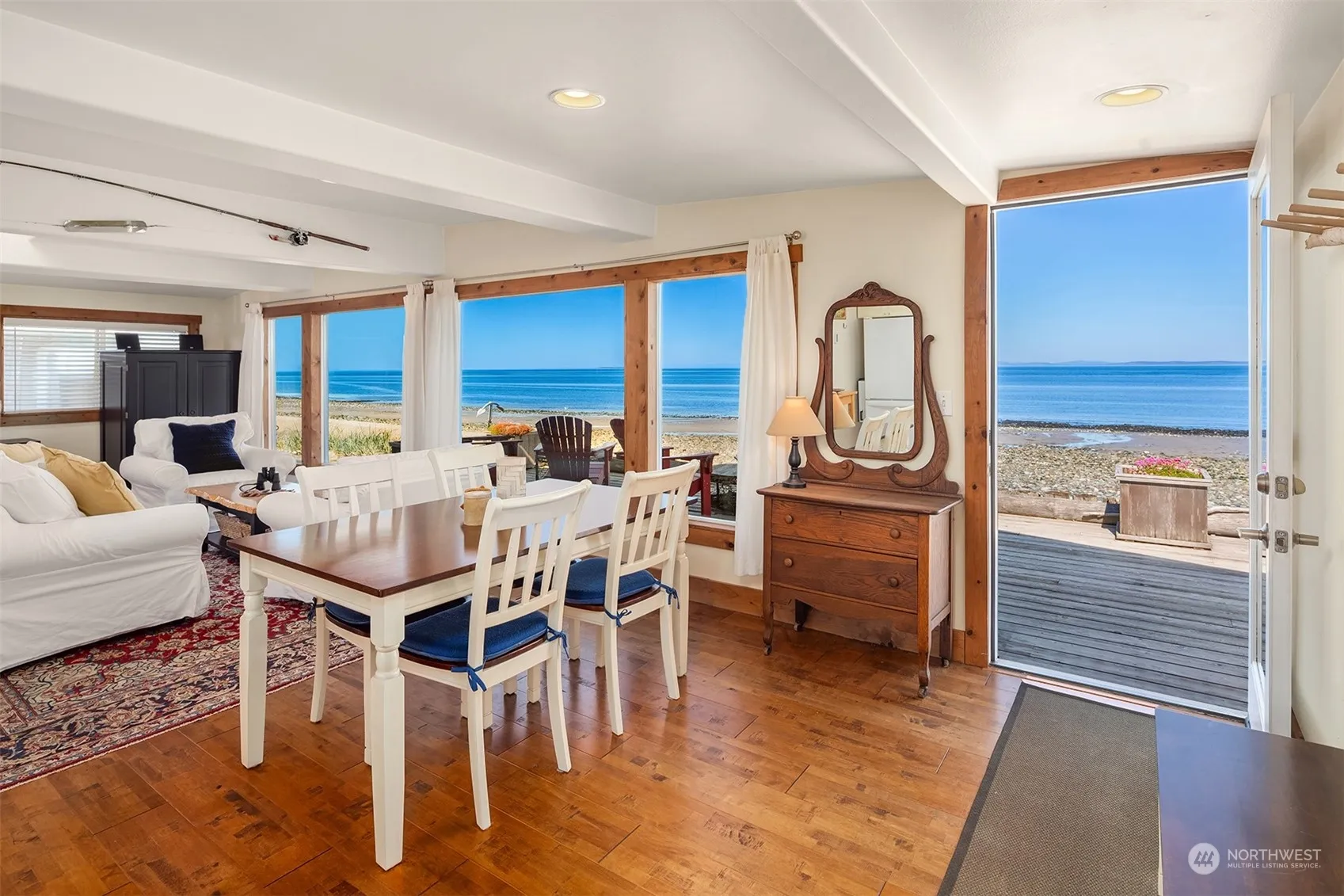 Welcome to your dream beachfront bungalow, overflowing w/ charm + comfort with wide plank wood floors, updated kitchen including a farmhouse sink + every window framing a picturesque scene. NW facing deck overlooks the expansive beach inviting countless adventures. Capture breathtaking sunsets, indulge in Dungeness crabbing right from your backyard + revel in endless views from the Olympic Mts to the Straights across to Vancouver Island + the San Juans. With Swan Lake Park and Joseph Whidbey State Park each a stone’s throw away + the ocean at your doorstep, this home offers a tranquil retreat + an intimate connection with nature. Ideal as a vacation rental or private haven, embrace your own slice of paradise for ultimate beachfront living.