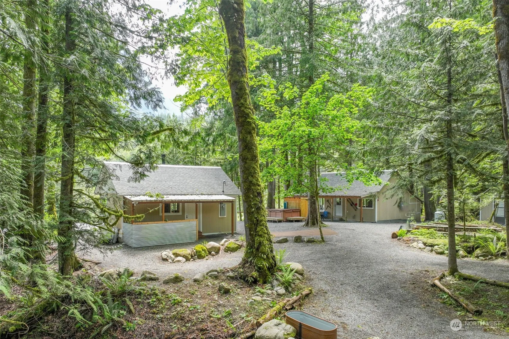 WATERFRONT LIVING w/130+ feet of prime riverfront! 2 cabins with amazing views. Cabin#1 ~ open concept, lg {view} picture windows, antique gas stove, generac w/auto transfer switch, wood stove and deck. Cabin#2 (bunkhouse) ~ open concept, 2 extra rooms, live edge bar, view deck. Separate washhouse w/infrared heater, sliding doors, on demand, water closet, laundry + room for sauna. Hot tub w/adj. primitive shower. 40ft Conex offers 20′ apt/20′ storage. Upgraded roofs, permitted 4C 200 amp panel, insulation, remote fans, led lighting, flooring, windows -n- decks. 7X25 shop space. Pressure pump and tank supplies water to 3 bldgs. RV/tent spaces/tons of parking. World class recreation! .73 Acres. 30 min to Stevens Pass, 1 hr to Seattle.